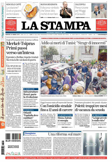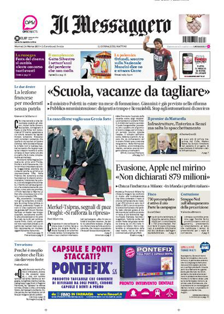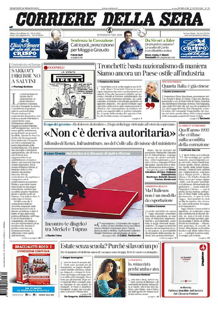 ROMA – Le prime pagine dei giornali di martedì 24 marzo. La Stampa: “Merkel-Tsipras. Primi passi verso un’intesa”. Il Corriere della Sera: “Renzi: non c’è deriva autoritaria”. La Repubblica: “Tregua Merkel-Tsipras. Shulz: patto in 7 giorni se Atene abbassa i toni”.