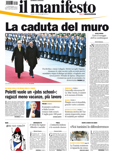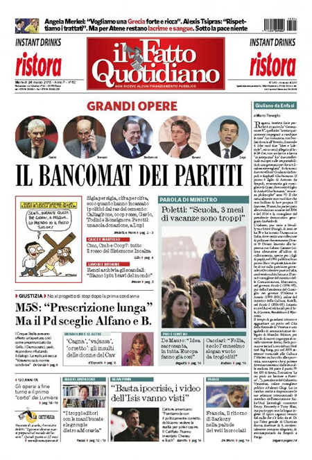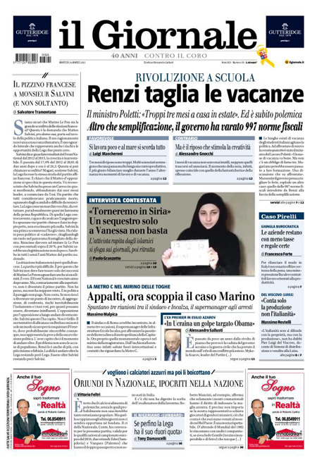 Il Giornale: “Rivoluzione a scuola. Renzi taglia le vacanze”. Il Manifesto: “La caduta del muro”. Il Fatto Quotidiano: “Grandi opere. Il bancomat dei partiti”. Libero: “La Repubblica dei raccomandati. Anche il Pd tiene famiglia”.