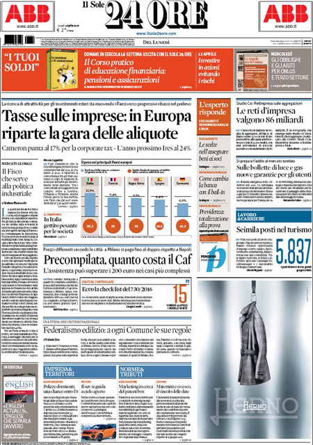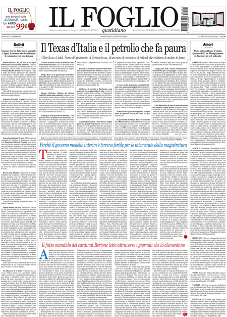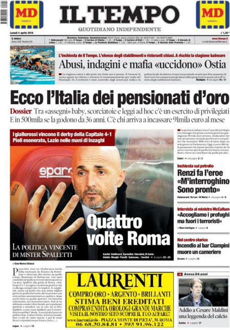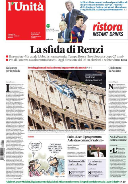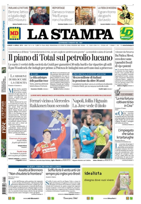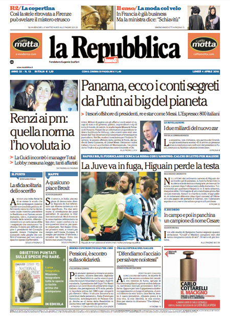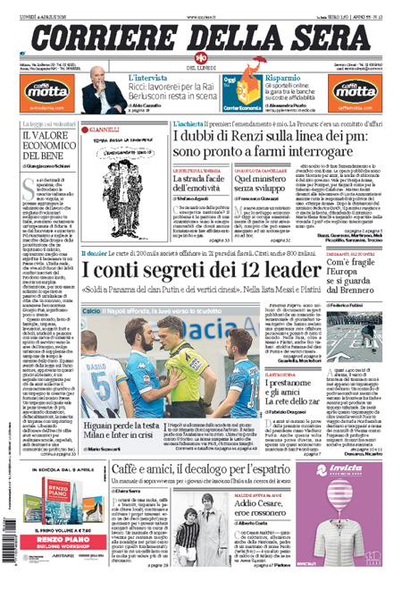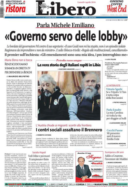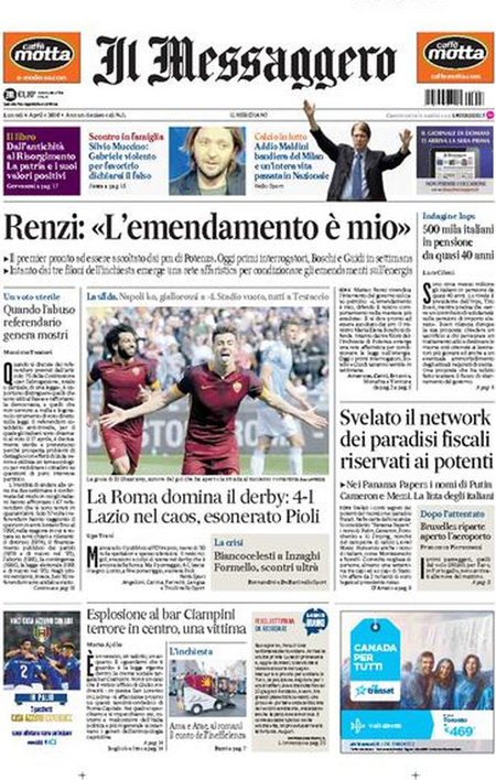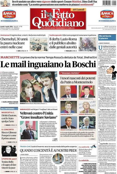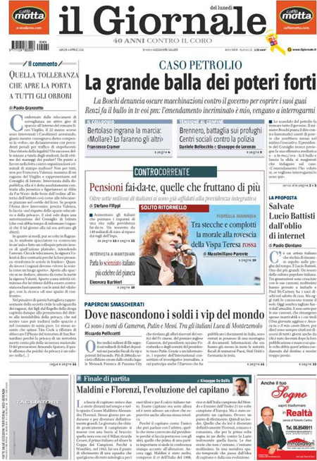 ROMA – Queste le prime pagine dei giornali di lunedรฌ 4 aprile.ย Lโinchiesta della procura di Potenza sullโimpianto di estrazione petrolifera di Tempa Rossa รจ ancora la notizia in apertura su tutti i giornali, con lโintervento di ieri del Presidente del Consiglio Matteo Renzi che ha rivendicato a sรฉ la decisione di inserire nella legge di stabilitร 2015 lโemendamento al centro delle polemiche in questi giorni che ha portato alle dimissioni del ministro per lo sviluppo economico Federica Guidi. Molto spazio sulle prime pagine รจ dedicato anche alla pubblicazione di un elenco di persone che hanno conti bancari nei paradisi fiscali, che include fra gli altri Vladimir Putin, Lionel Messi e Michel Platini, ai risultati della domenica calcistica con la sconfitta del Napoli e lโespulsione di Higuain, e al ricordo di Cesare Maldini.ย Queste le prime pagine dei giornali di lunedรฌ 4 aprile.