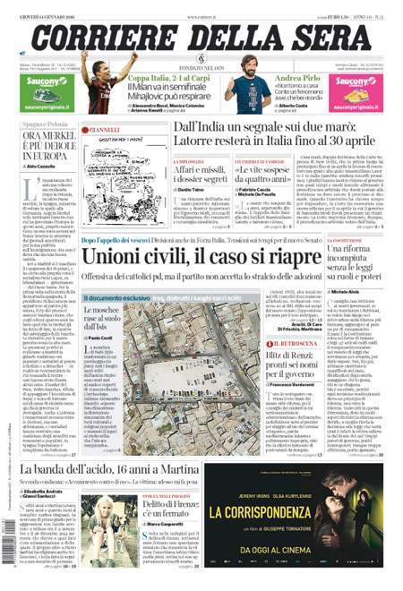 ROMA – Queste le prime pagine dei giornali di giovedì 14 gennaio. La prima pagina della Stampa: “Bruxelles a Renzi: basta critiche, siete stati favoriti. Il commissario europeo Moscovici: conti pubblici, avete avuto molto. A Palazzo Chigi il controllo delle società pubbliche”. La prima pagina del Corriere della Sera: “Unioni civili, il caso si riapre. Offensiva dei cattolici Pd, ma il partito non accetta lo stralcio delle adozioni”. La prima pagina de La Repubblica: “Rivolta nel Pd sulle unioni civili: no alle adozioni. Strappo di 30 cattolici dem, legge in pericolo. Intervista con Bersani: dobbiamo rimanere uniti”.
