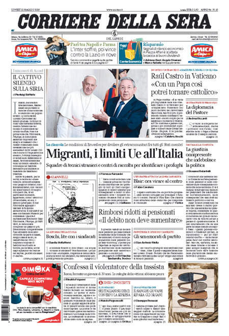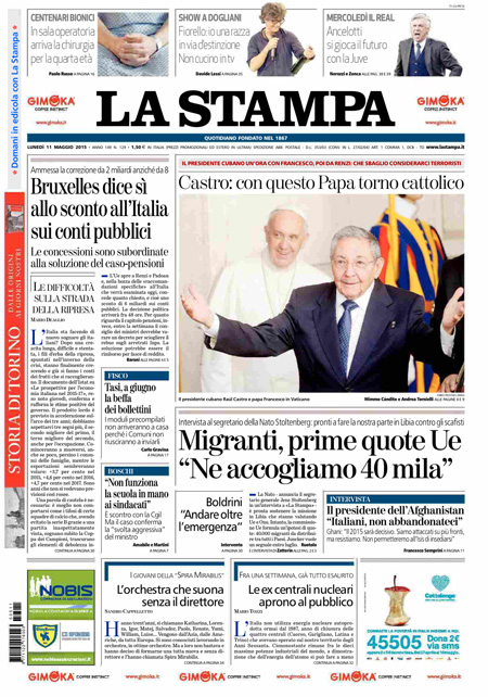 ROMA – Le prime pagine dei giornali di lunedì 11 maggio. La Stampa: “Bruxelles dice sì allo sconto all’Italia sui conti pubblici”. Il Corriere della Sera: “Migranti, i limiti Ue all’Italia”. La Repubblica: “Ecco il piano delle Tlc, banda ultralarga all’Enel”.