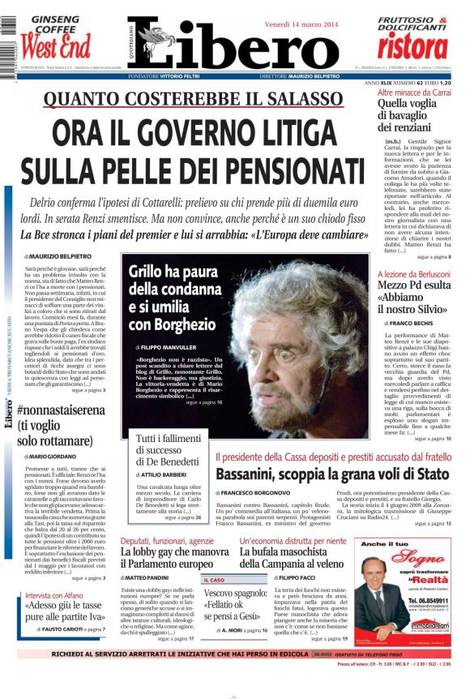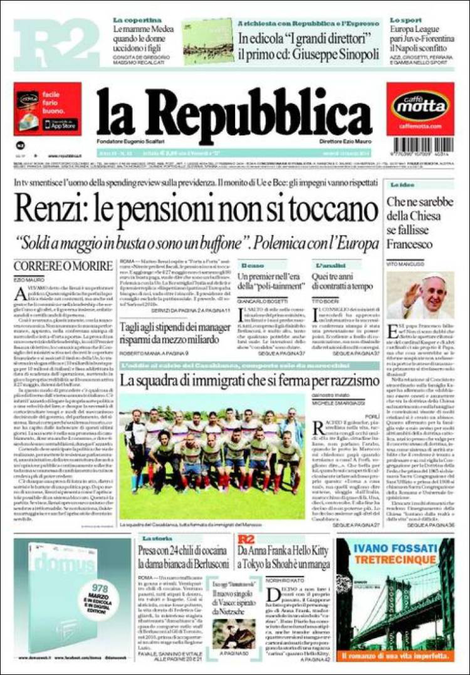 La prima pagina di Repubblica: “Renzi: le pensioni non si toccano”.