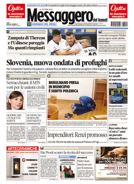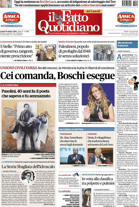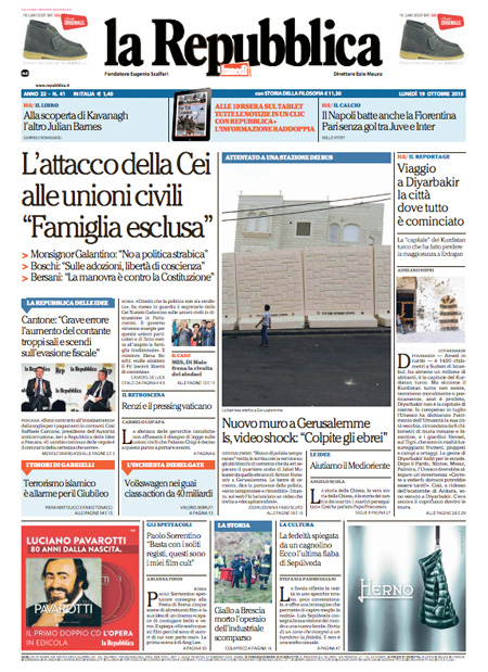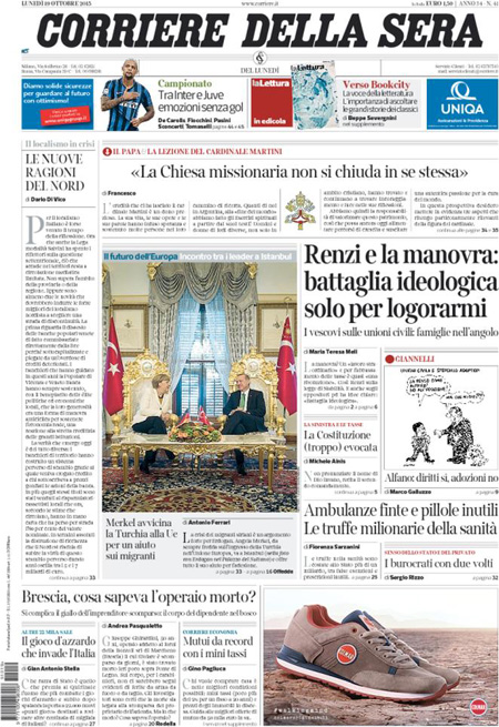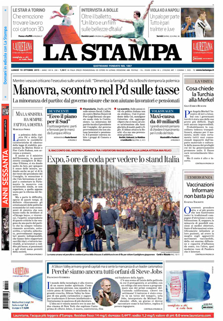 ROMA – Le prime pagine dei giornali di lunedì 19 ottobre. La prima pagina de La Stampa: “Manovra, scontro nel Pd sulle tasse”. La prima pagina del Corriere della Sera: “Renzi e la manovra: battaglia ideologica solo per logorarmi”. La prima pagina de La Repubblica: “L’attacco della Cei alle unioni civili: famiglia esclusa”.