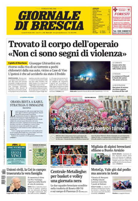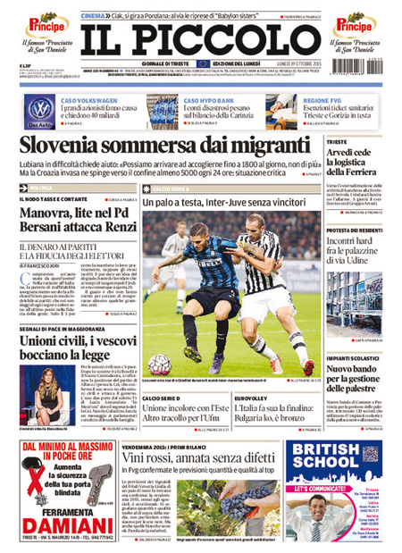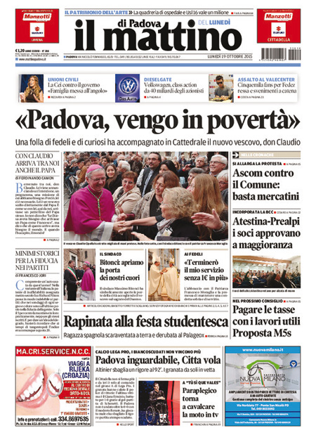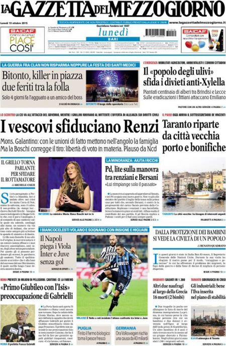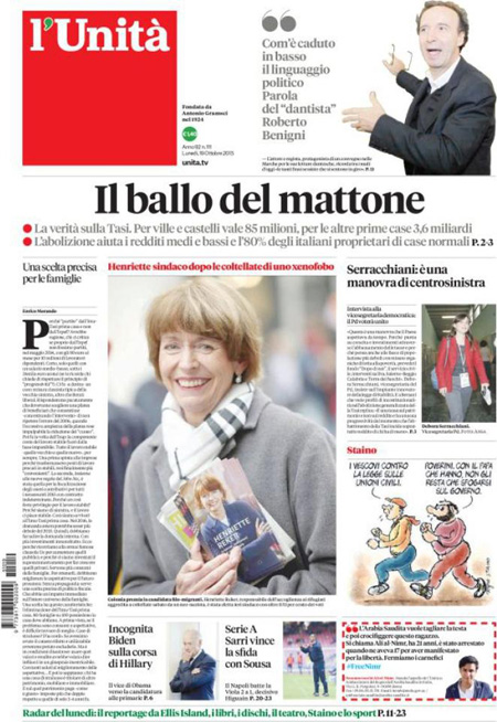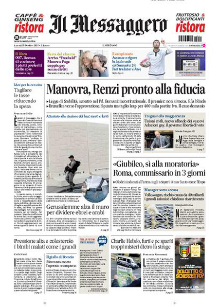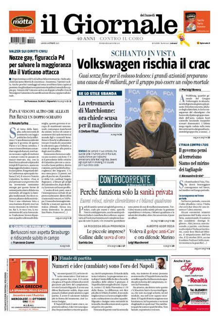 La prima pagina del Messaggero: “Manovra, Renzi pronto alla fiducia. Legge di stabilità, scontro nel Pd. Bersani: incostituzionale. Il premier: non si tocca. E la blinda”. La prima pagina de L’Unità: “Il ballo del mattone. La verità sulla Tasi. Per ville e castelli vale 85 milioni. Per le altre case 3,6 miliardi”. La prima pagina del Giornale: “Volkswagen rischia il crac. Guai senza fine per il colosso tedesco: i grandi azionisti preparano una causa da 40 miliardi, per il gruppo può essere un colpo mortale”. La prima pagina del Tempo: “Meloni e 5 Stelle per Roma. La sorpresa è l’ex sindaco. Una ricerca Datamedia prevede un testa a testa. Sale il partito pro-Marino con Marchini outsider di lusso”. Queste le prime pagine dei giornali di lunedì 19 ottobre.