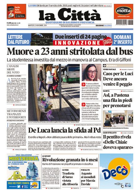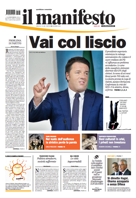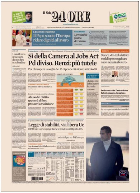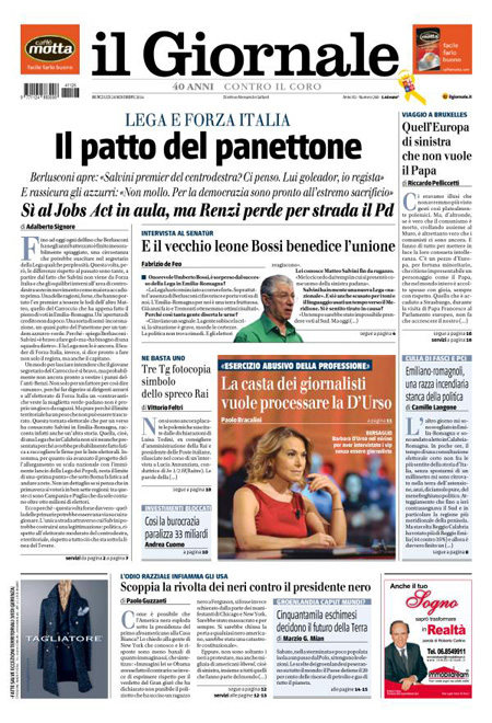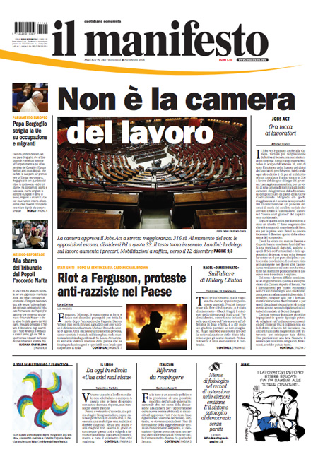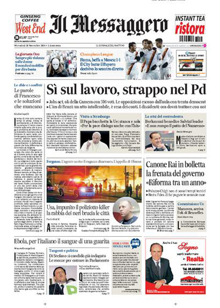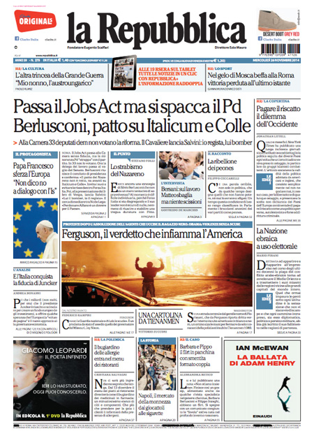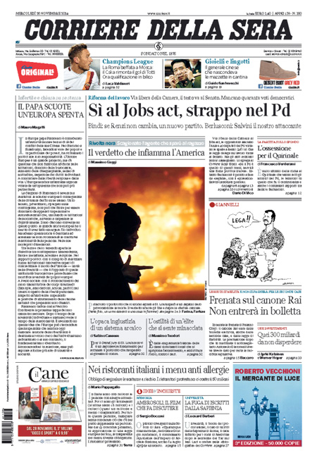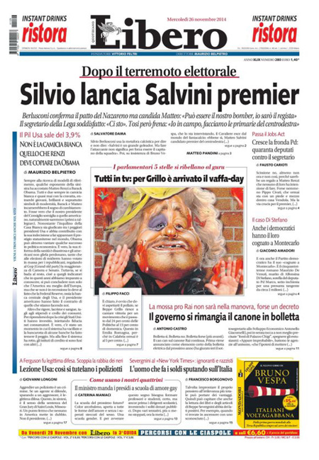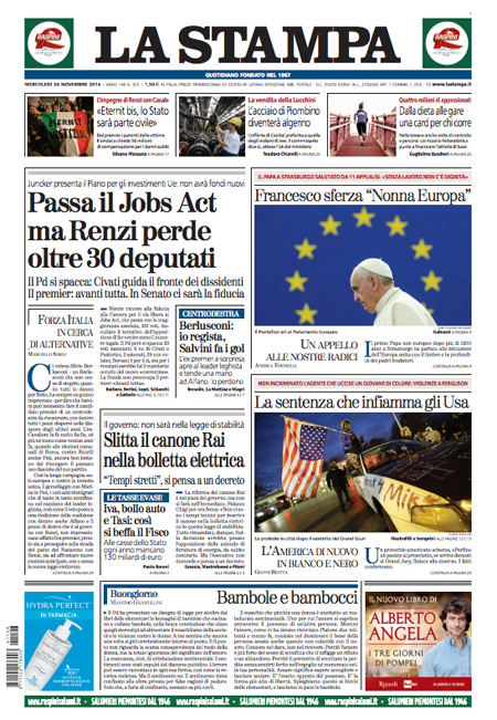 ROMA – Le prime pagine dei giornali di mercoledì 26 novembre 2014. Matto Renzi, Jobs Act, Berlusconi-Salvini: le prime pagine dei giornali. La Stampa: “Passa il Jobs Act ma Renzi perde oltre 30 deputati”. Il Corriere della Sera: “Sì al Jobs Act, strappo nel Pd”. La Repubblica: “Passa il Jobs Act ma si spacca il Pd. Berlusconi, patto su Italicum e Colle”. Il Giornale: “Lega e Forza Italia, il patto del panettone”. Libero: “Silvio lancia Salvini premier”. Il Manifesto: “Non è la Camera del lavoro”. Il Fatto Quotidiano: “I 750mila secondari azzoppano Renzi”.