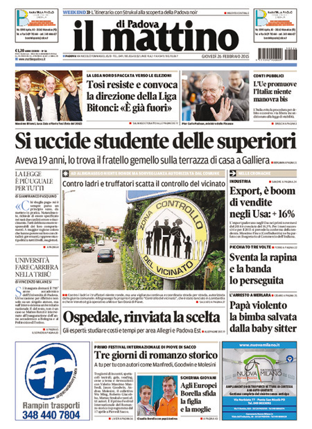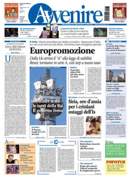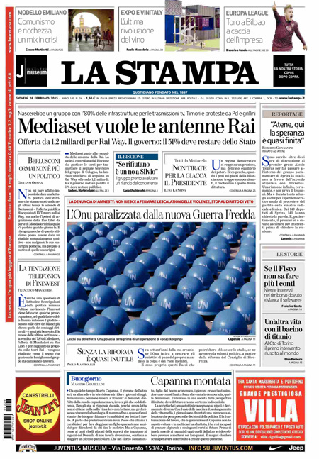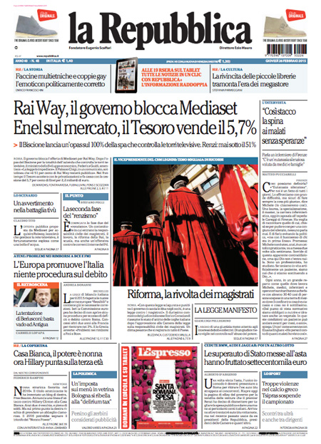 ROMA – Le prime pagine dei giornali di giovedì 26 febbraio. La Stampa: “Mediaset vuole le antenne Rai”. Il Corriere della Sera: “Conti, l’Italia passa l’esame”. La Repubblica: “Rai Way, il governo blocca Mediaset. Enel sul mercato, il Tesoro vende il 5,7%”.