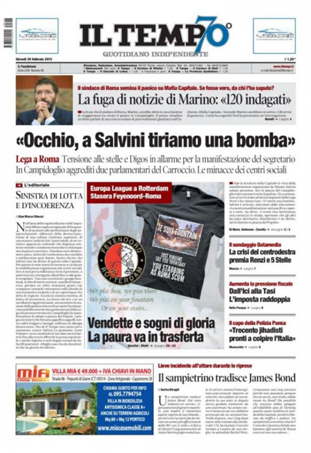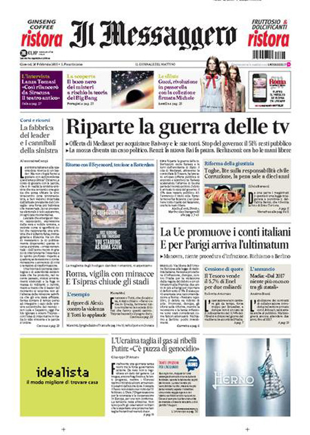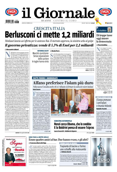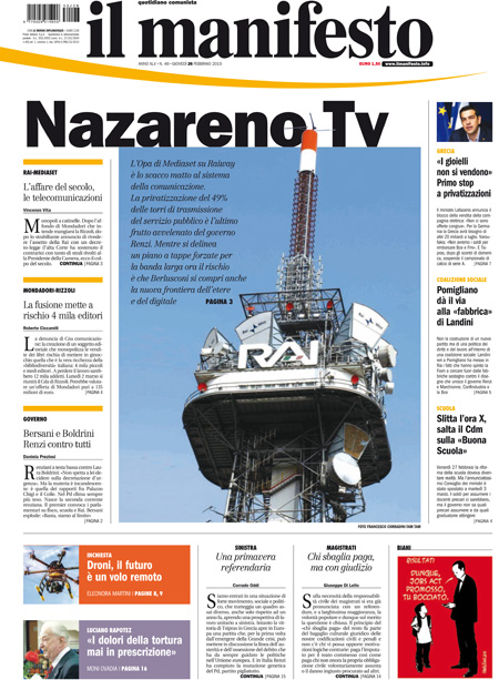 Il Sole 24 Ore: “Il Governo ferma Mediaset”. Il Messaggero: “Riparte la guerra delle Tv”. Il Giornale: “Berlusconi ci mette 1.2 miliardi. Mediaset lancia un’offerta per le antenne Rai”. Il Manifesto: “Nazareno Tv”. Il Fatto Quotidiano: “Mediaset premier”. Libero: “Il Cav muove le torri e dà scacco a Renzi”.