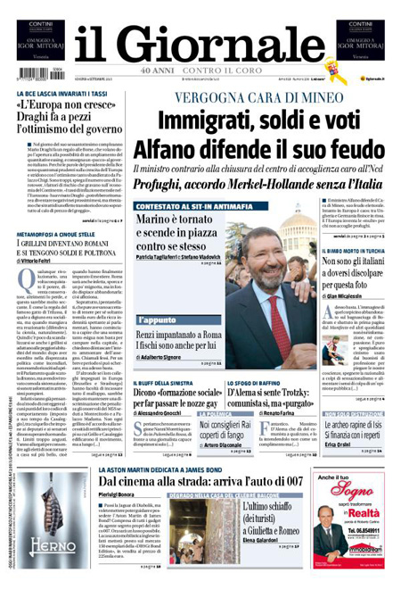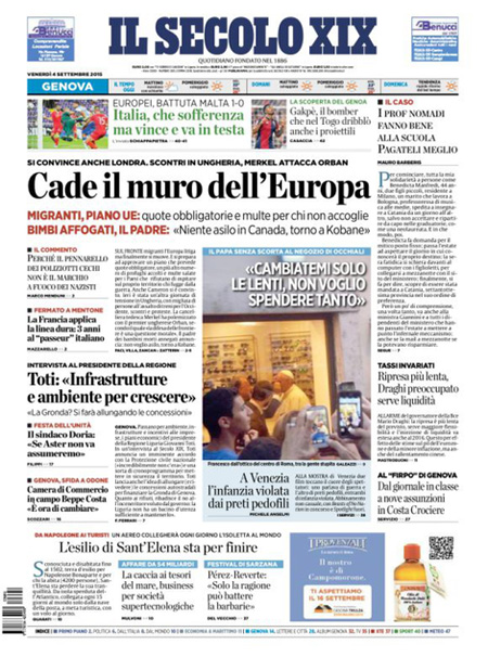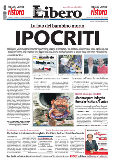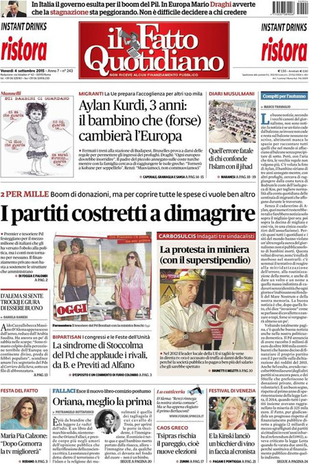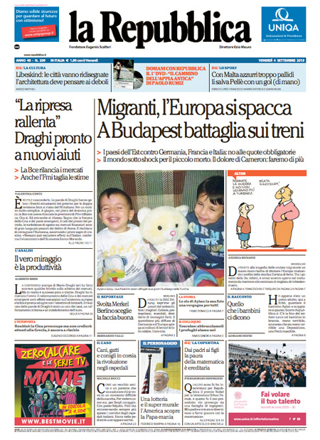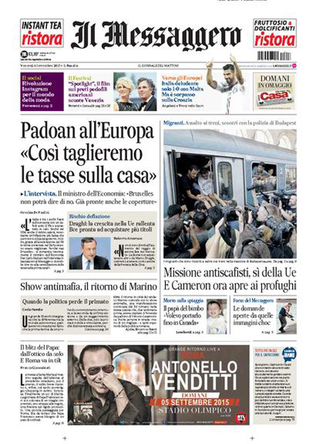 ROMA – Le notizie sull’immigrazione sono sempre in apertura su tutti i quotidiani di oggi, 4 settembre, ancora con il caos alla stazione di Budapest e il treno diretto in Germania che è stato deviato verso un campo profughi al confine con l’Austria, le pressioni di Francia, Germania e Italia per aumentare il numero delle persone accolte in Europa e di prevedere sanzioni per i paesi che non si adeguano alle nuove quote, e la storia del padre dei bambini morti in Turchia, con Libero che accusa di ipocrisia i giornali che hanno pubblicato la foto del bambino morto sulla spiaggia.