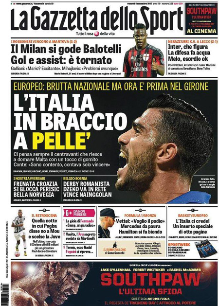 I quotidiani sportivi titolano sulla vittoria molto sofferta dell’Italia con Malta per le qualificazioni europee, giocando sul fatto che il gol decisivo di Pellè è stato segnato con il braccio.