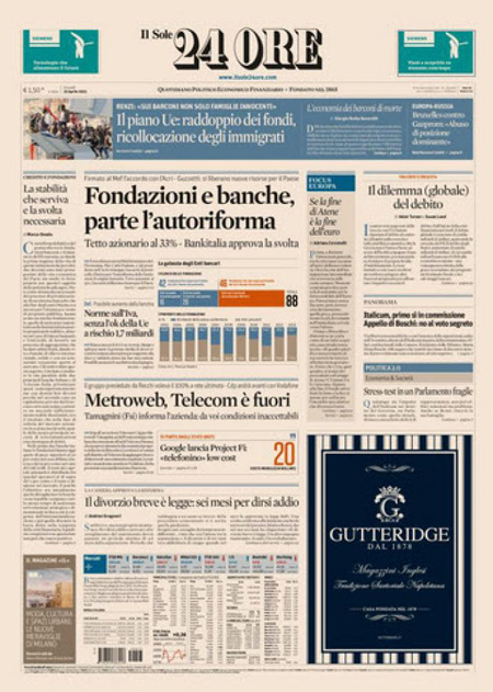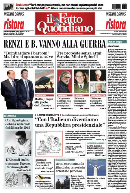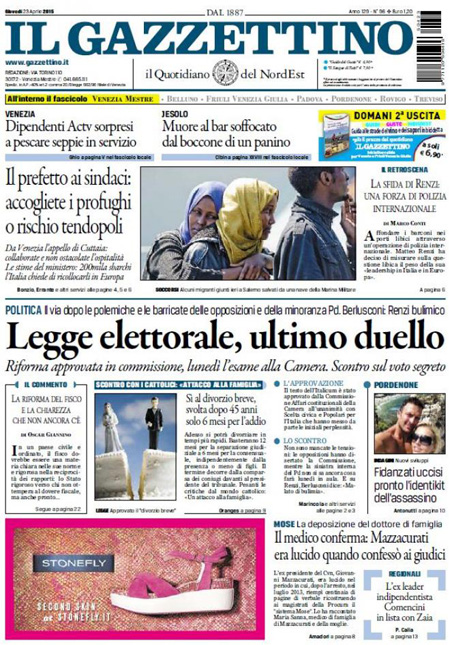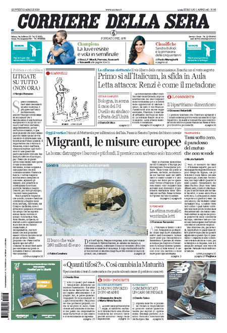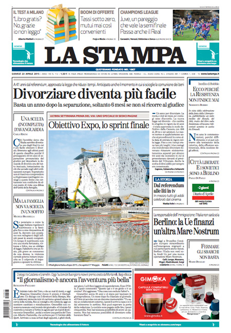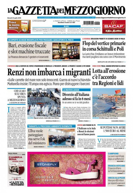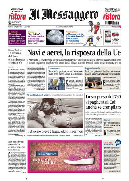 ROMA – Le notizie nelle aperture dei quotidiani di oggi, 23 aprile, sono il Consiglio europeo straordinario sull’immigrazione in programma oggi a Bruxelles che dovrebbe decidere quali regole attuare per bloccare le partenze dei barconi dall’Africa, l’approvazione definitiva della nuova legge sul divorzio, che accorcia i tempi di attesa dopo la separazione, e il voto favorevole in Commissione Affari Costituzionali sulla legge elettorale, che sarà esaminata in aula alla Camera da lunedì.