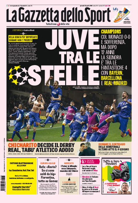I giornali sportivi celebrano il pareggio con il Monaco della Juventus, che si qualifica per le semifinali di Champions League insieme a Real Madrid, Barcellona e Bayern Monaco.