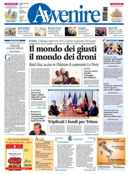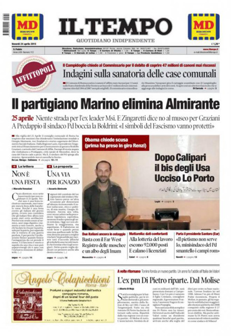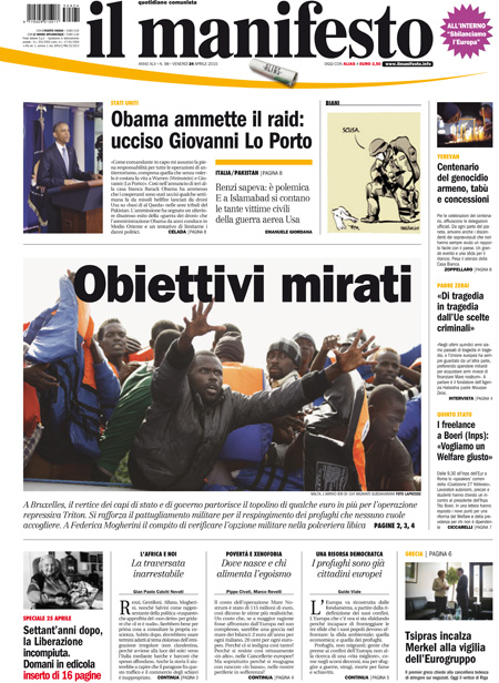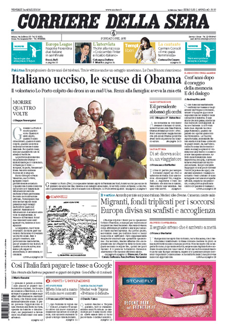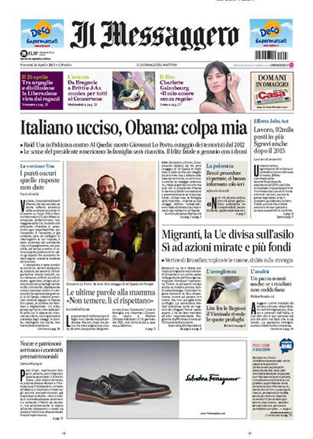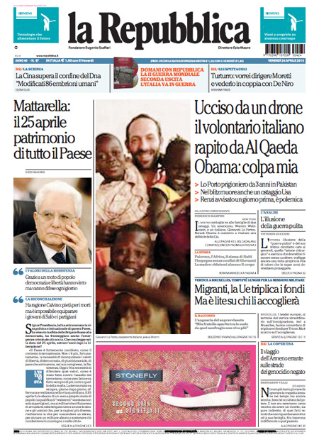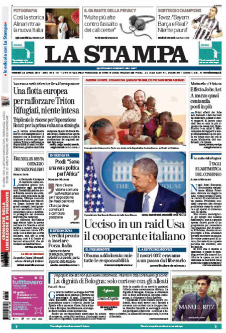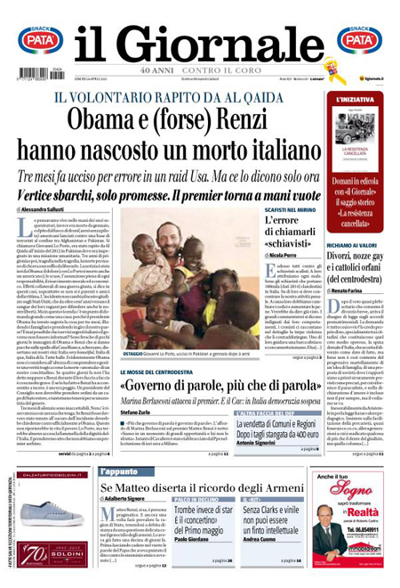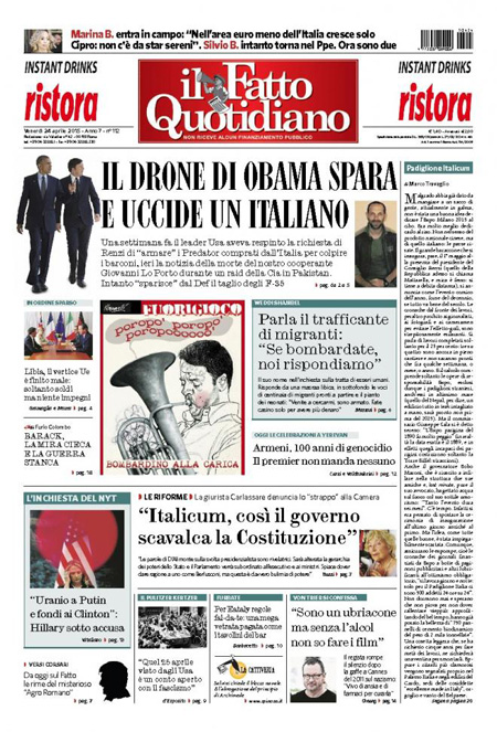 Il Messaggero: “Italiano ucciso. Obama: colpa mia”. Il Giornale: “Obama (e forse Renzi) hanno nascosto un morto italiano”. Il Fatto Quotidiano: “Il drone di Obama spara e uccide un italiano”.