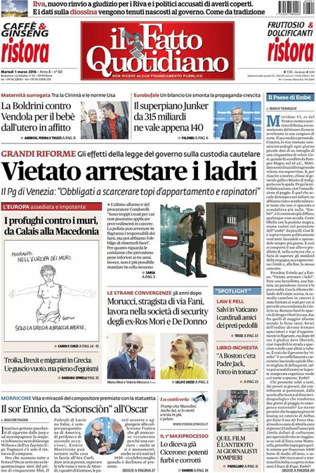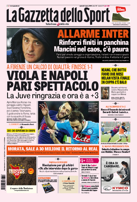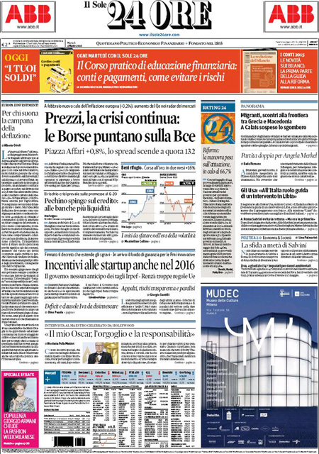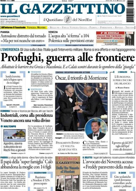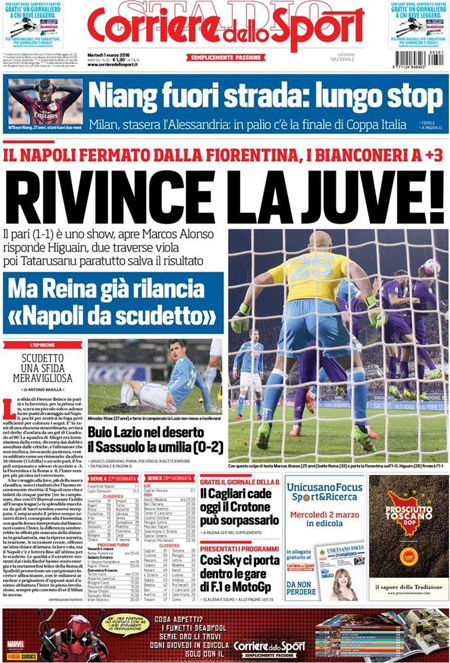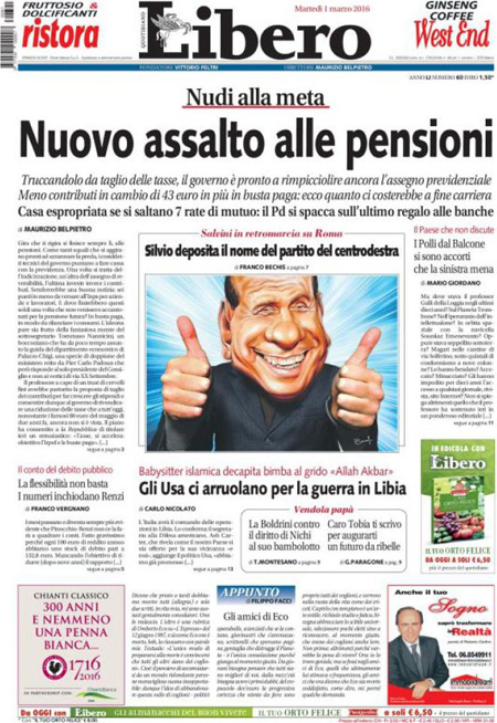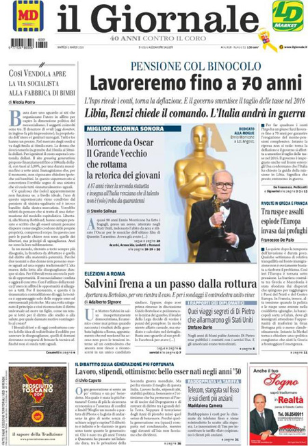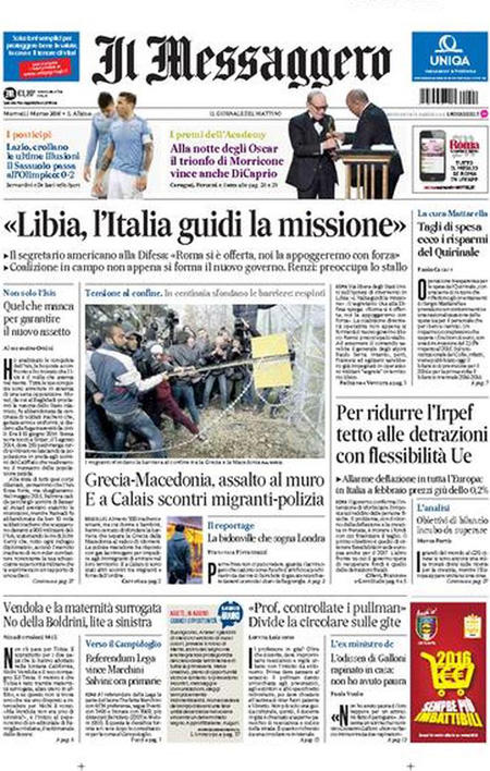 Il Corriere della Sera e il Messaggero si occupano invece della missione internazionale in Libia contro l’ISIS, mentre Libero e il Giornale sono allarmati per le pensioni degli italiani, e i quotidiani sportivi titolano sul pareggio di ieri sera fra Fiorentina e Napoli, che lascia la Juventus in testa alla classifica con tre punti di vantaggio proprio sul Napoli.