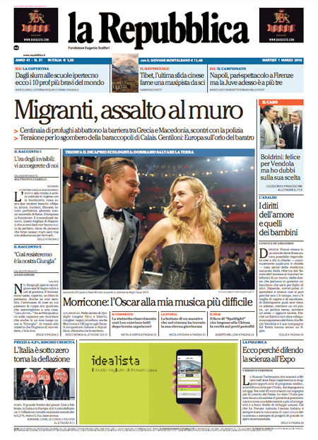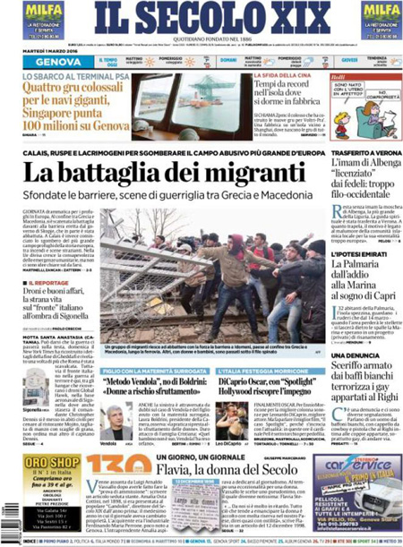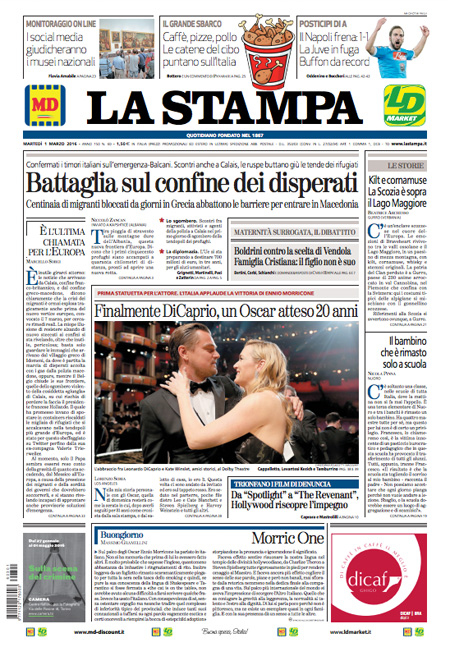 ROMA – Per la maggior parte dei giornali di oggi, 1 marzo, le notizie in apertura riguardano l’arrivo dei migranti in Europa, con gli scontri di ieri al confine fra Grecia e Macedonia dove un gruppo di profughi ha sfondato una recinzione, lo sgombero della “giungla” di Calais, e l’arrivo in Italia di 93 profughi siriani provenienti dal Libano.