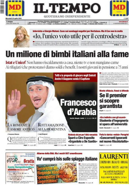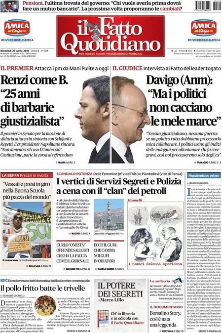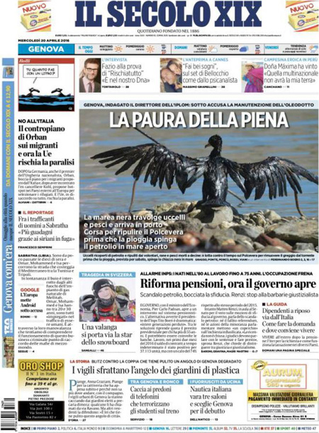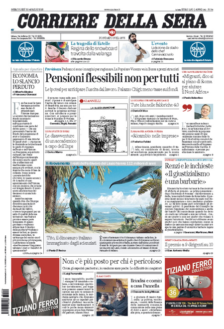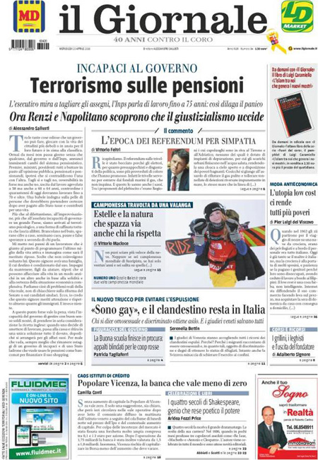 La prima pagina del Messaggero: “Pensioni, flessibilitร su misura”. La prima pagina del Giornale: “Terrorismo sulle pensioni”. La prima pagina del Manifesto: “L’oro nero”. ย La prima pagina di Libero: “Banche e pensioni: altre sorprese”. La prima pagina del Fatto Quotidiano: “Renzi come B.: 25 anni di barbarie giustizialista”.ย Queste le prime pagine dei giornali di mercoledรฌ 20 aprile.