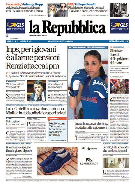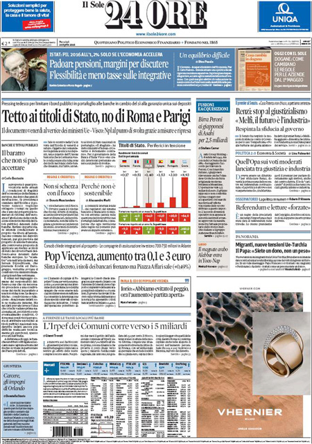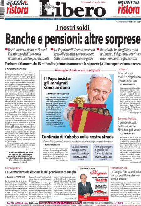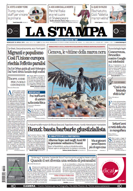 ROMA – Queste le prime pagine dei giornali di mercoledรฌ 20 aprile. La prima pagina de La Stampa: “Migranti e populismo. Cosรฌ l’Unione europea rischia l’effetto paralisi”. La prima pagina del Corriere della Sera: “Pensioni flessibili non per tutti”. La prima pagina de La Repubblica: “Inps, per i giovani รจ allarme pensioni. Renzi attacca i pm”. La prima pagina del Sole 24 Ore: “Tetto ai titoli di Stato, no di Roma e Parigi”.