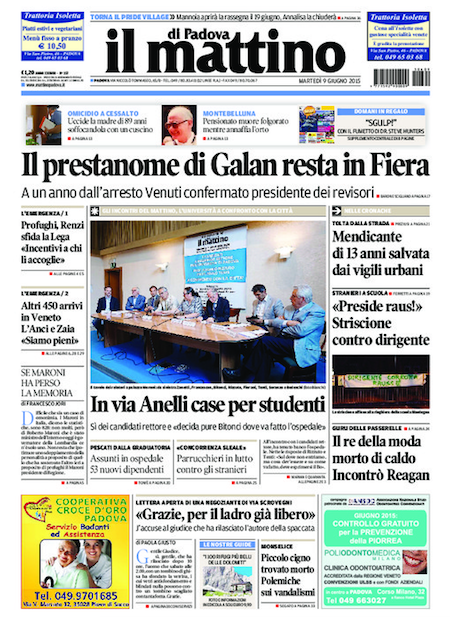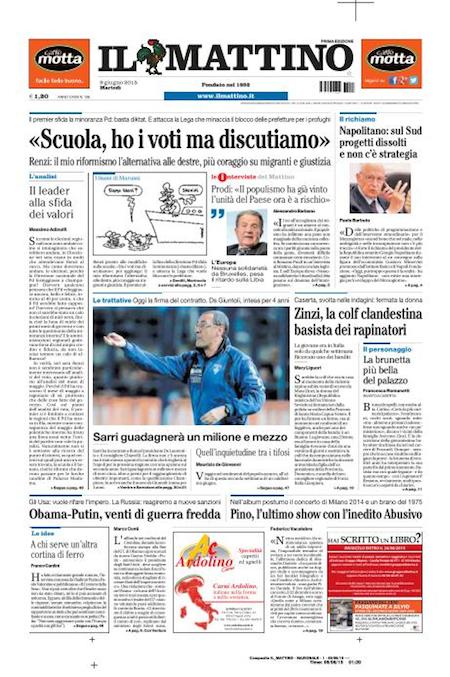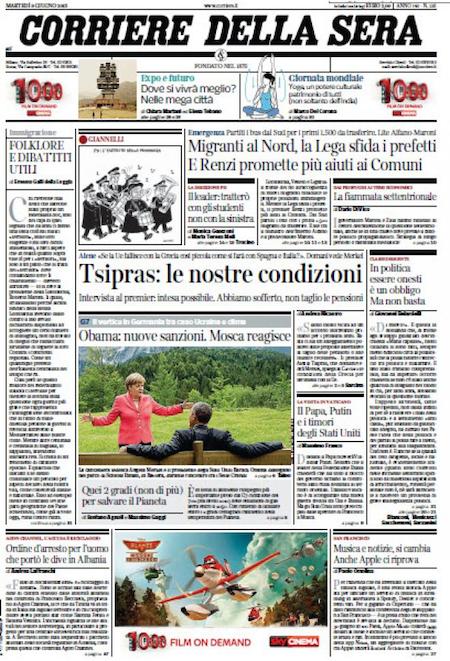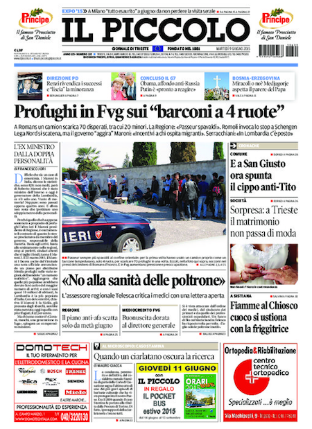 ROMA – Le prime pagine dei giornali di martedì 9 giugno. La Repubblica: “Premi ai Comuni che ospitano i migranti. Scontro Nord-Sud”. Il Corriere della Sera: “Migranti al Nord, la Lega sfida i prefetti”. La Stampa: “Renzi avvisa la minoranza: basta diktat”.