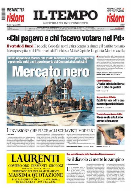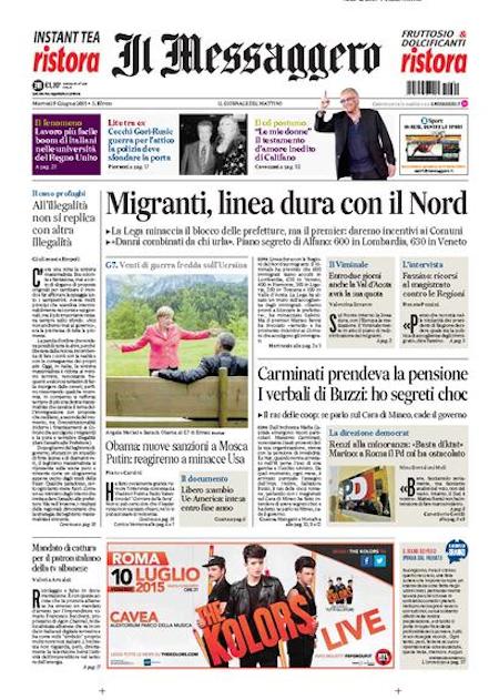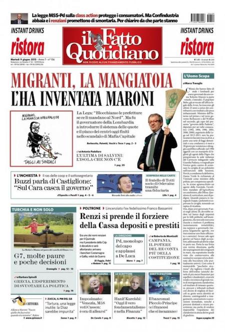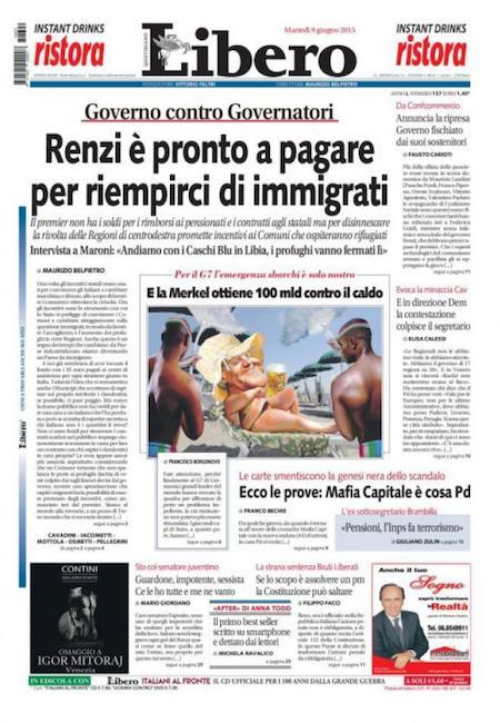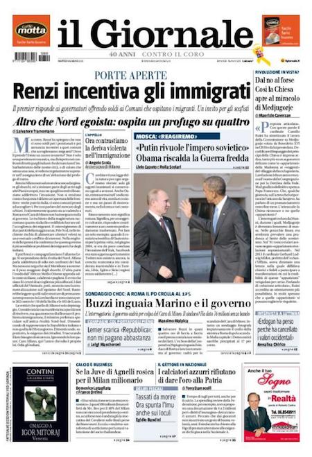 Il Fatto Quotidiano: “Migranti, la mangiatoia l’ha inventata Maroni”. Il Messaggero: “Migranti, linea dura col Nord”. Il Giornale: “Renzi incentiva gli immigrati”. Libero: “Renzi è pronto a pagare per riempirci di immigrati”.