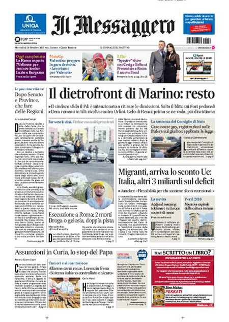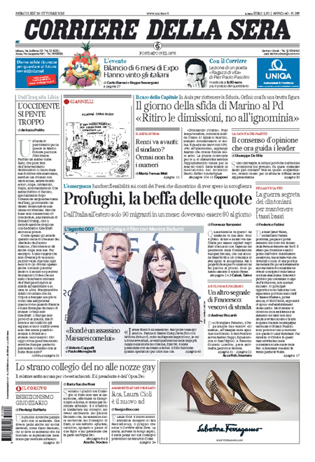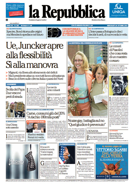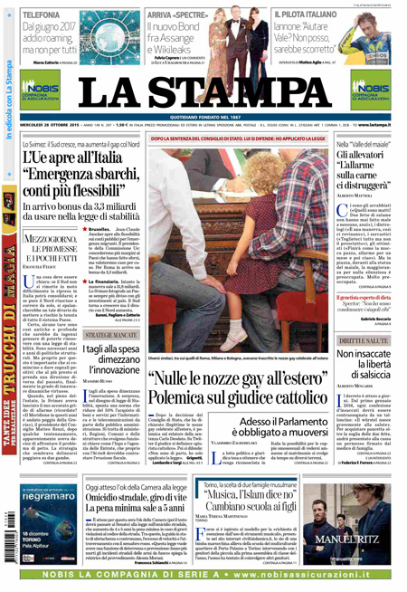 ROMA – Le prime pagine dei giornali di mercoledรฌ 28 ottobre. La prima pagina de La Stampa: “L’Ue apre all’Italia: emergenza sbarchi, conti piรน flessibili”. La prima pagina del Corriere della Sera: “Profughi, la beffa delle quote. Dall’Italia all’estero solo 90 migranti in un mese: dovevano essere 80 al giorno”. L’editoriale di Antonio Polito sul Corriere della Sera: “L’occidente si pente troppo”. La prima pagina de La Repubblica: “Ue, Juncker apre alla flessibilitร . Sรฌ alla manovra. Migranti, via libera allo sforamento del deficit. Ma il presidente attacca: non tutti fanno abbastanza”. La prima pagina de Il Messaggero: “Il dietrofront di Marino: resto. Il sindaco sfida il Pd: รจ intenzionato a ritirare le dimissioni”.