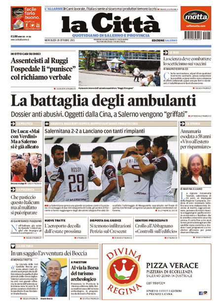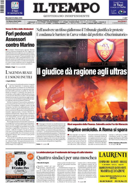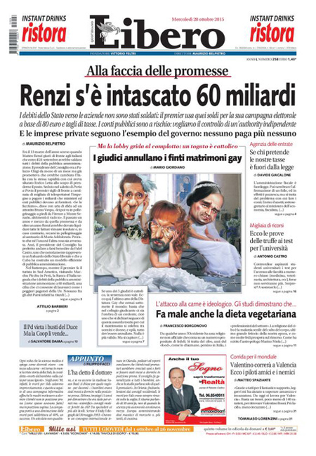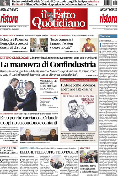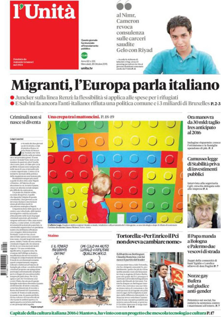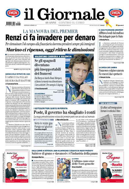 La prima pagina de Il Giornale: “La manovra del premier. Renzi ci fa invadere per denaro”. La prima pagina de Il Fatto Quotidiano: “La manovra di Confindustria”. L’editoriale di Marco Travaglio sul Fatto Quotidiano: “Vale tutto”. La prima pagina de L’Unitร : “Migranti, l’Europa parla italiano”. La prima pagina di Libero: “Alla faccia delle promesse. Renzi s’รจ intascato 60 miliardi”. La prima pagina de Il Tempo: “Il Giudice dร ragione agli ultras. Nell’assolvere un tifoso giallorosso il Tribunale giustifica le proteste. E condanna le barriere in Curva volute dal prefetto”. Queste le prime pagine di mercoledรฌ 28 ottobre,