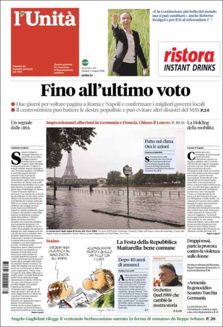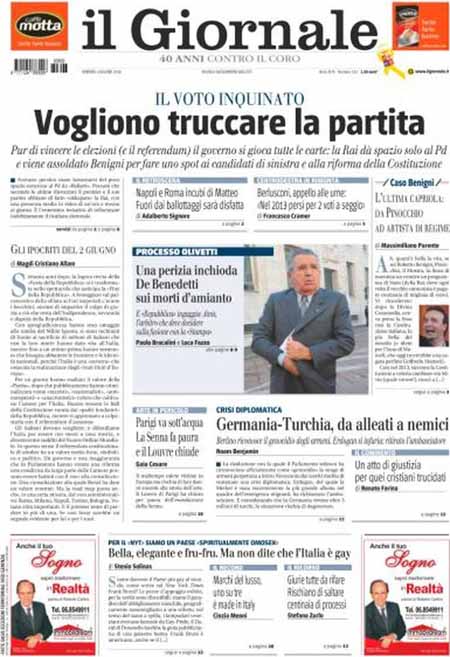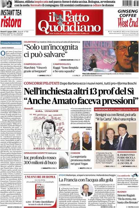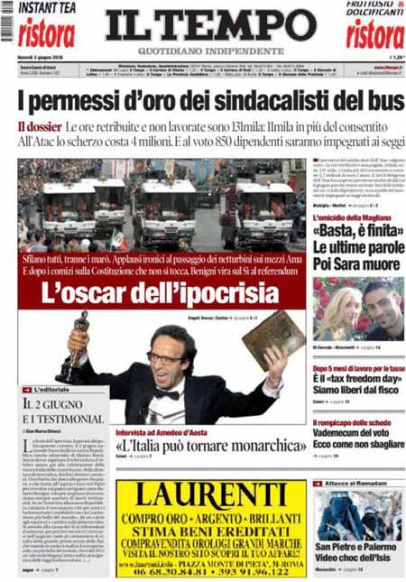 La prima pagina del Giornale: “Il voto inquinato. Vogliono truccare la partita”. La prima pagina di Libero: “Berlusconi: occhio che risorgo”. La prima pagina del Tempo: “I permessi d’oro dei sindacalisti del bus”.ย Queste le prime pagine di venerdรฌ 3 giugno.