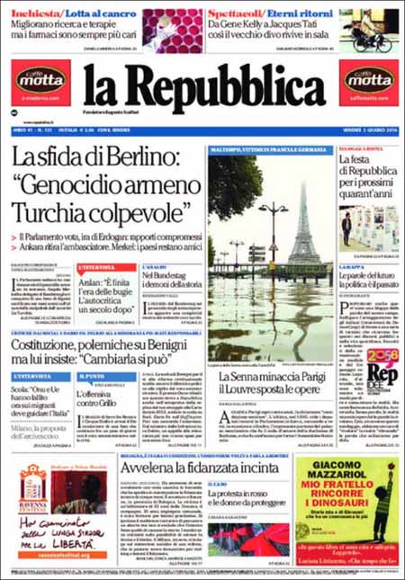 ROMA – Queste le prime pagine di venerdรฌ 3 giugno. La prima pagina del Corriere della Sera: “Mattarella: il 2 giugno un’Italia migliore”. La prima pagina de La Stampa: “Ue, prime luci di ripresa. Ma รจ crisi diplomatica tra Merkel e Erdogan”. La prima pagina de La Repubblica: “La sfida di Berlino: genocidio armeno. Turchia colpevole”.