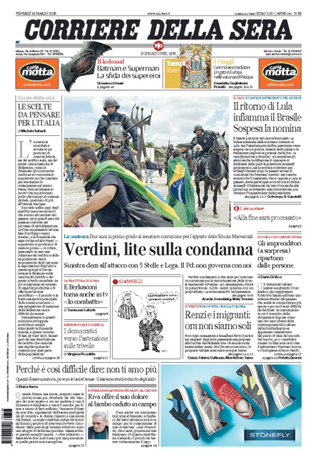 ROMA – Queste le prime pagine dei giornali di venerdรฌ 18 marzo. La prima pagina de La Stampa: “Europa, ultima offerta alla Turchia. Ankara riprenda i migranti illegali in cambio di finanziamenti. Londra: allarme profughi dalla Libia”. La prima pagina del Corriere della Sera: “Verdini, lite sulla condanna. Sinistra dem all’attacco con 5 Stelle e Lega. Il Pd: non governa con noi”. La prima pagina de La Stampa: “Fermiamo il genocidio Isis. Kerry: impediremo nuove stragi. Pinotti sulla missione in Libia: non sarร un altro Iraq”.