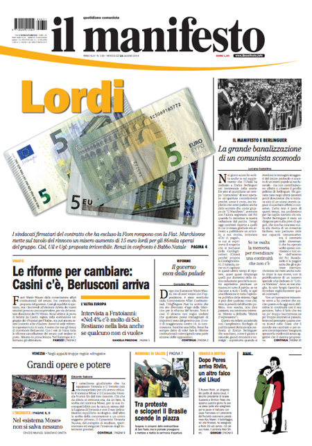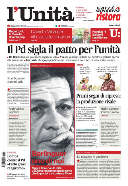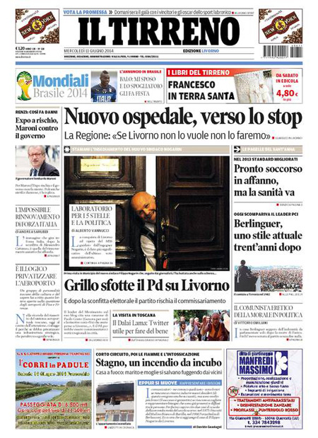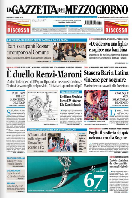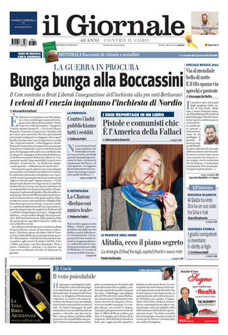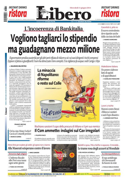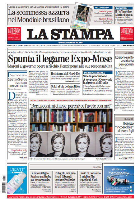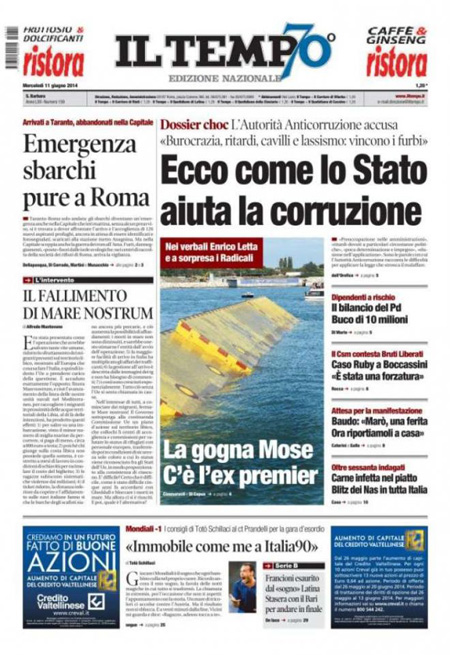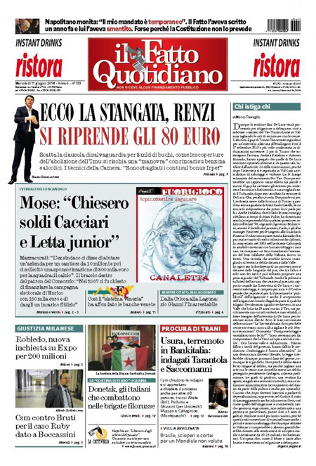 ROMA – Notizie diverse in apertura sui giornali di oggi, mercoledì 11 giugno. Le inchieste sul Mose a Venezia e sull’Expo di Milano, con la polemica a distanza fra il presidente della regione Lombardia Maroni e il presidente del consiglio Renzi, i dati sulla produzione industriale di aprile, che vedono l’Italia unico paese del G7 in crescita, un’inchiesta sulla complicata normativa fiscale italiana.