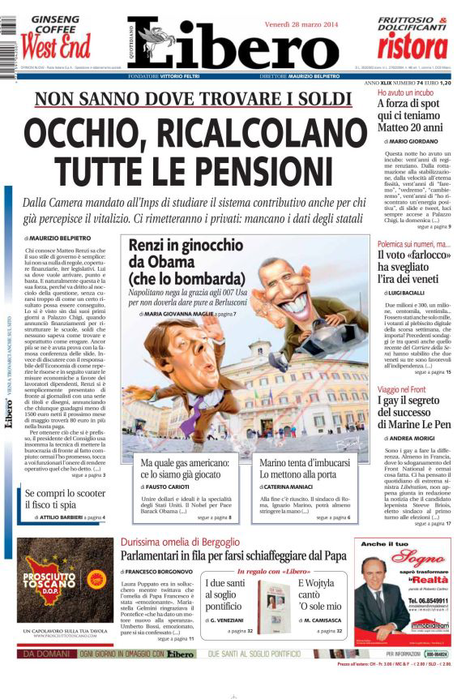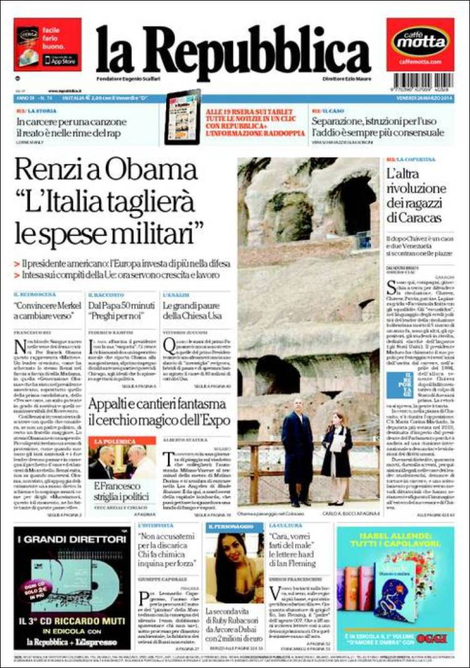 La prima pagina di La Repubblica: “Renzi a Obama: l’Italia taglierร le spese militari”.