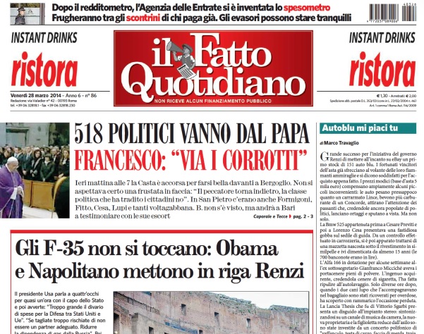 Il Fatto Quotidiano: “518 politici vanno dal Papa. Francesco: Via i corrotti”.