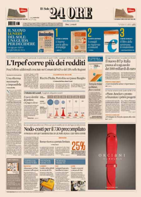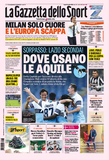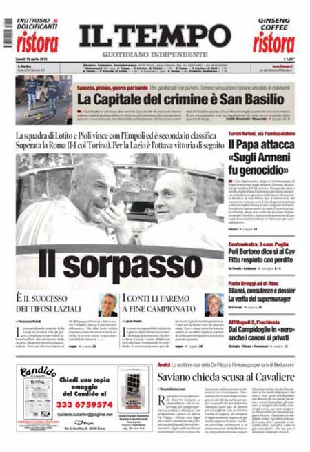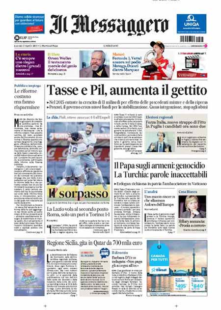 Il Giornale: “Il genocidio dei cristiani. Renzi lascia il Papa solo”. Il Tempo: “Il sorpasso”. Il Messaggero: “Tasse e Pil, aumenta il gettito”. La Gazzetta dello Sport: “Sorpasso: Lazio seconda”.