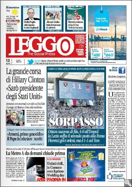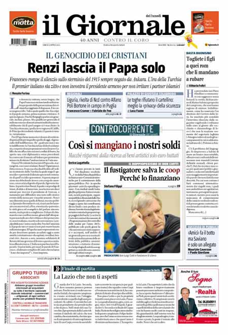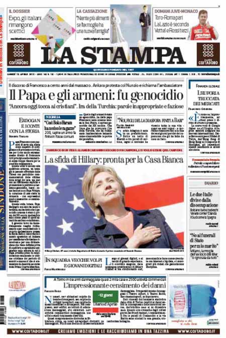 ROMA – Le prime pagine dei giornali di lunedì 13 aprile. Il Corriere della Sera: “Il Papa riapre il caso armeno”. La Stampa: “Il Papa e gli armeni: fu genocidio”. La Repubblica: “Il bonus sarà per sette milioni di italiani”.