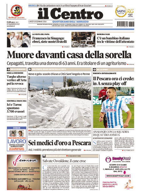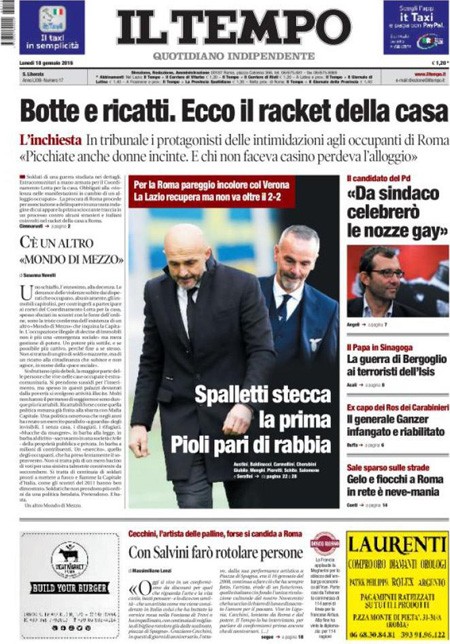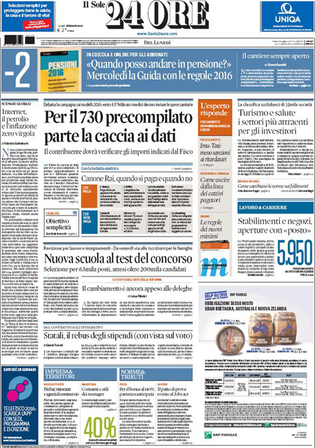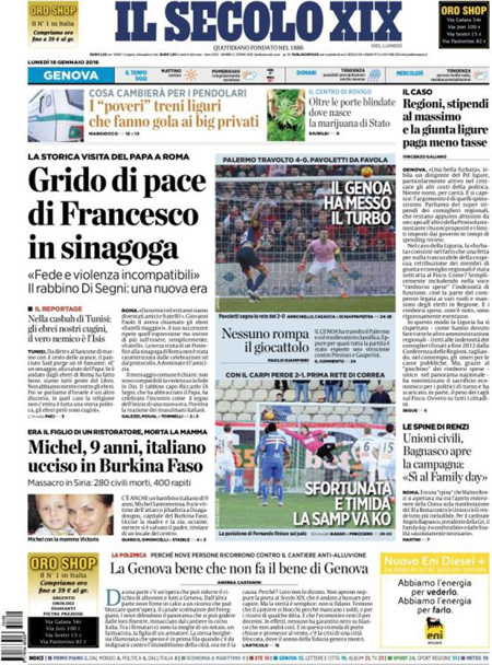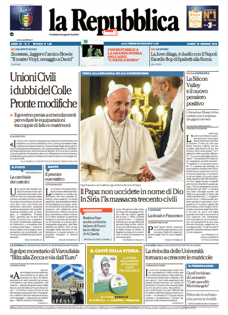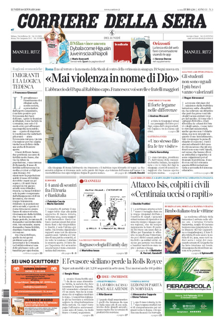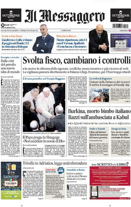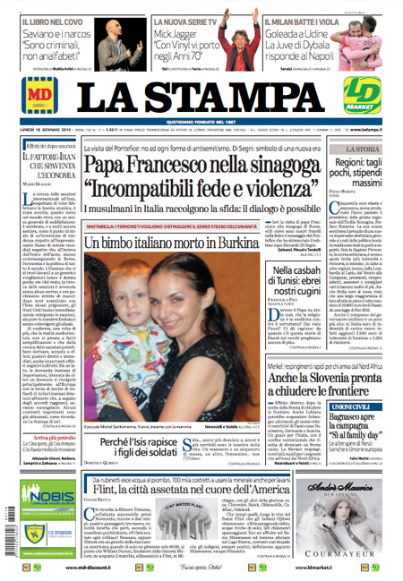 ROMA – Queste le prime pagine dei giornali di lunedì 18 gennaio. La prima pagina della Stampa: “Papa Francesco nella sinagoga: incompatibili fede e violenza”. La prima pagina del Corriere della Sera: “Mai violenza in nome di Dio. L’abbraccio del Papa al Rabbino capo. “. La prima pagina de La Repubblica: “Unioni civili, i dubbi del Colle. Pronte modifiche. Il governo pensa a emendamenti per evitare le equiparazioni tra coppie di fatto e matrimoni”. La prima pagina del Sole 24 Ore: “Per il 730 precompilato parte la caccia ai dati”. La prima pagina del Messaggero: “Svolta fisco, cambiano i controlli. In arrivo la riforma delle agenzie, verifiche meno invasive e più ricorso al Web”. La prima pagina del Giornale: “Emergenza sociale. I professionisti sono i nuovi poveri”.