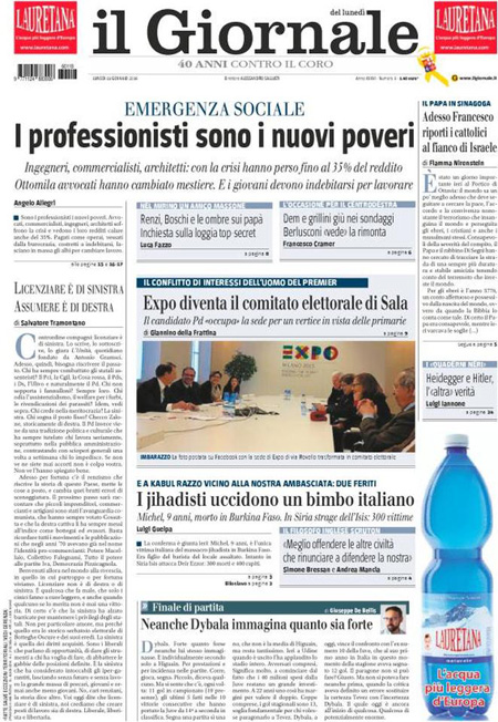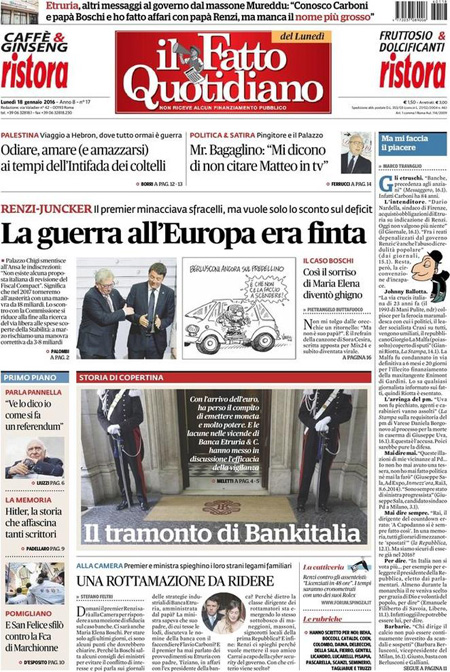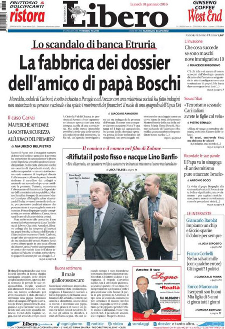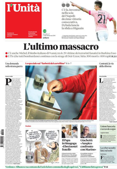 La prima pagina de L’Unità: “L’ultimo massacro”. La prima pagina di Libero: “Lo scandalo di banca Etruria. La fabbrica dei dossier dell’amico di papà Boschi”. La prima pagina del Fatto Quotidiano: “La guerra all’Europa era finita”. La prima pagina del Tempo: “Botte e ricatti. Ecco il racket della casa”. Papa Francesco, Siria, crisi, Matteo Renzi: queste le prime pagine dei giornali di lunedì 18 gennaio.