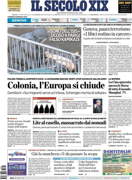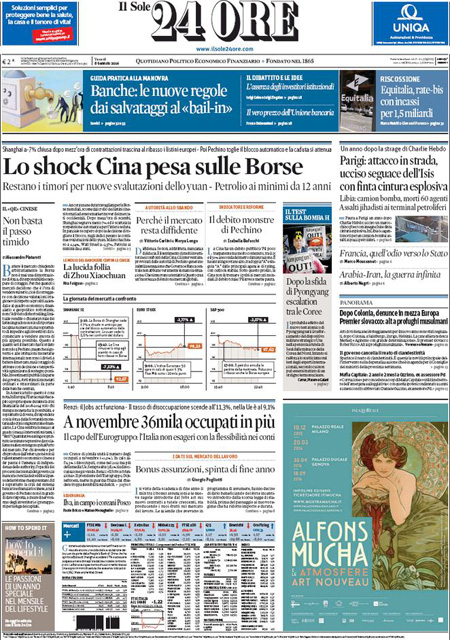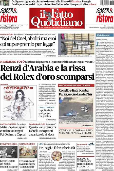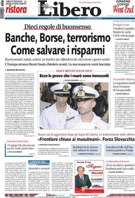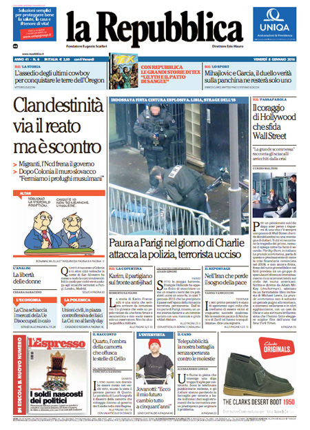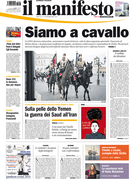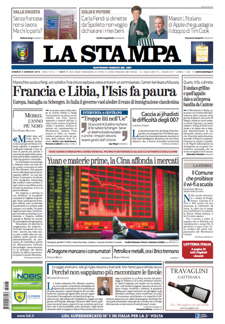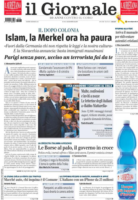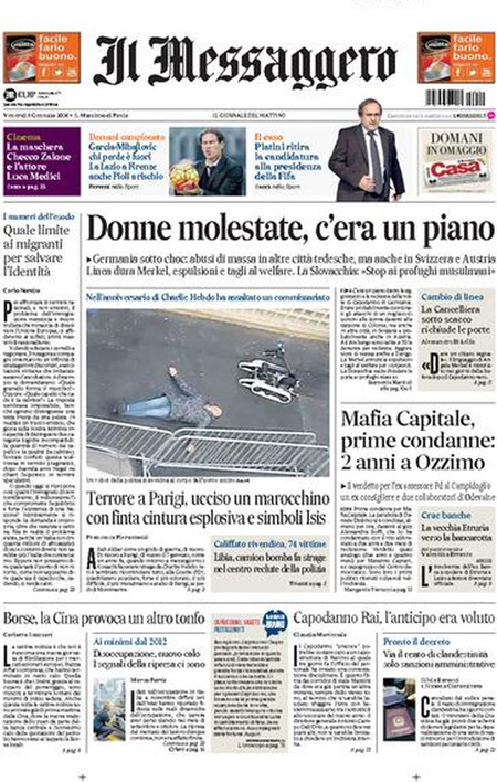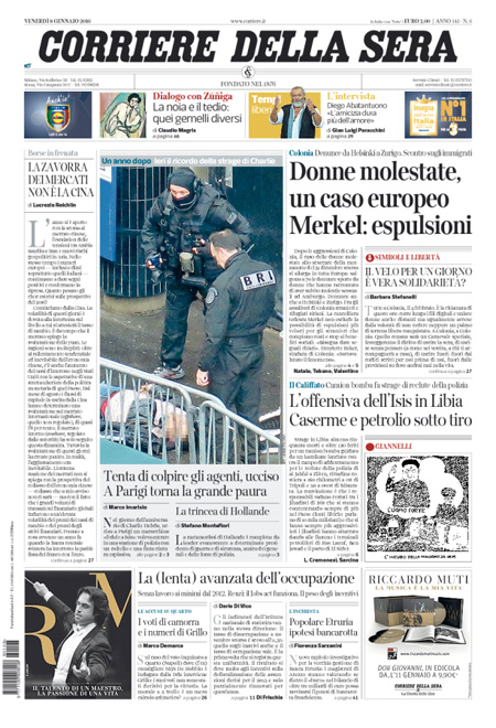 ROMA – In apertura sui quotidiani di oggi, 8 gennaio, ci sono diverse notizie: il tentato assalto a un commissariato di Parigi da parte di un uomo armato, che pare avesse con sé dei simboli dell’Isis, nel primo anniversario della strage nella redazione di Charlie Hebdo, ancora la vicenda delle violenze sulle donne a Colonia, e l’attentato contro una caserma della polizia in Libia, mentre altre notizie presenti su quasi tutte le prime pagine sono i dati ISTAT sull’occupazione di novembre, che indicano un calo della disoccupazione, e la nuova giornata nera della Borsa cinese, chiusa per l’eccesso di ribasso.