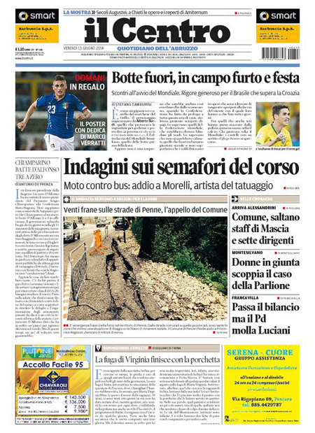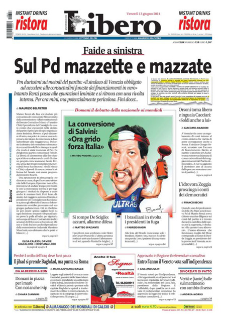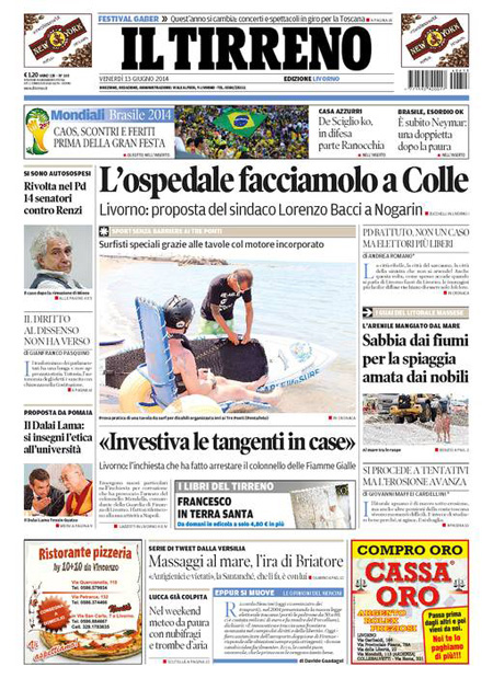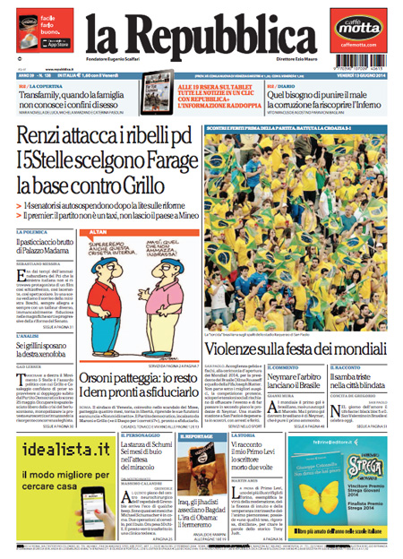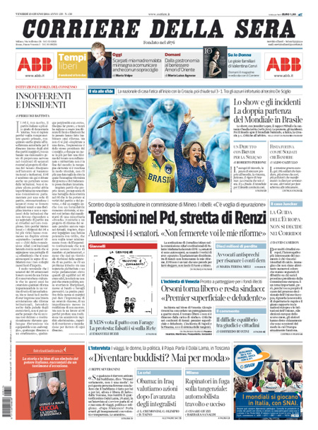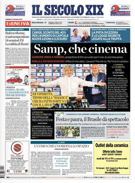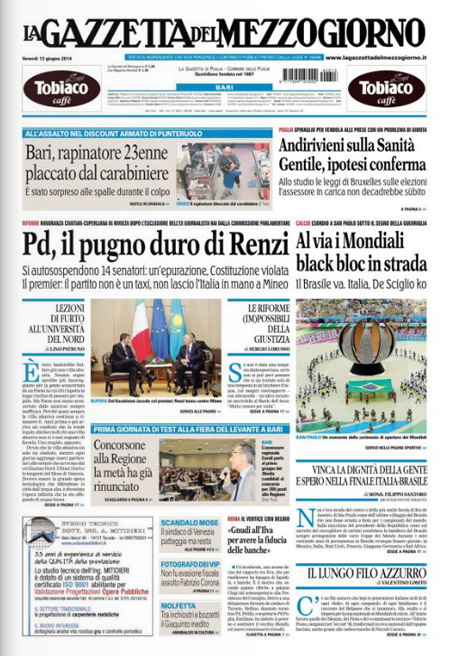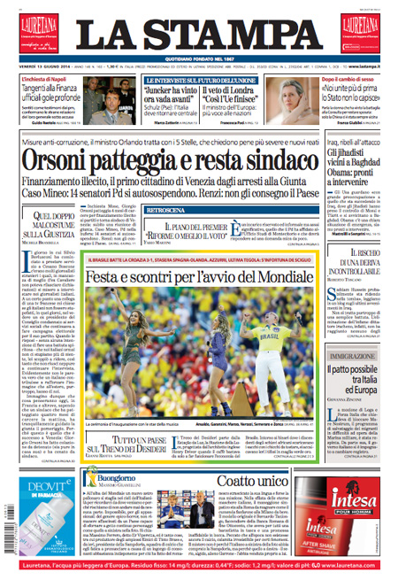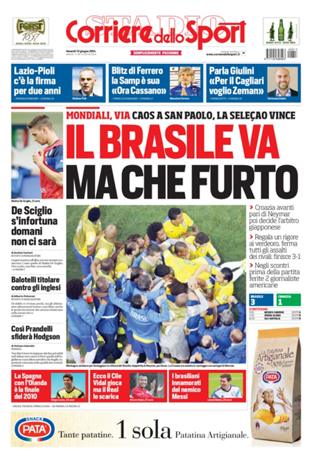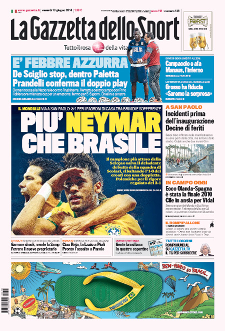 L’altra grande notizia su tutte le prime pagine è l’apertura dei mondiali in Brasile, con la vittoria del Brasile, aiutato dall’arbitro per battere la Croazia 3-1, e gli scontri fra manifestanti e polizia prima della cerimonia di apertura.