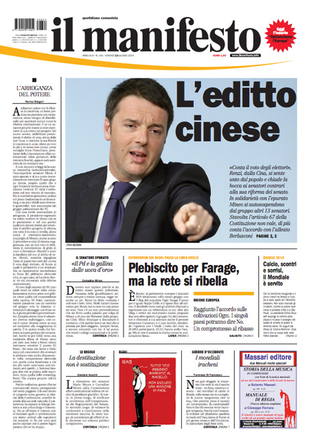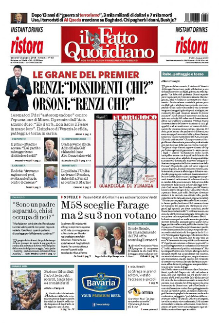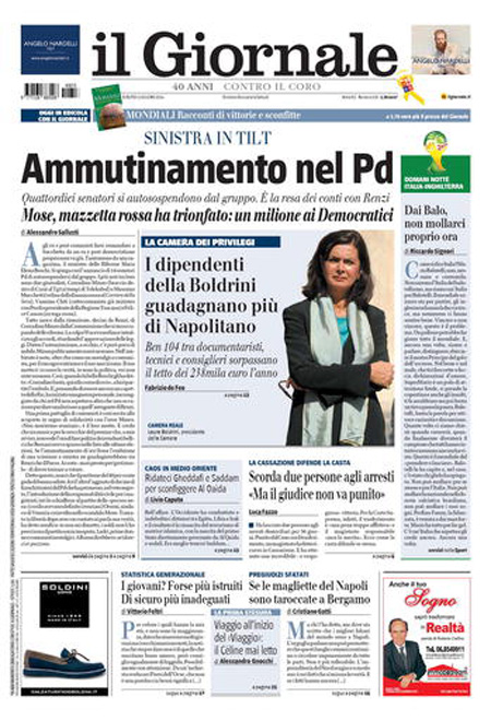 ROMA – La maggior parte dei giornali di oggi, venerdì 13 giugno, dedica l’apertura è dedicata alle nuove tensioni nel PD, dopo la decisione di 14 senatori del partito di autosospendersi per protestare contro la scelta di sostituire Vannino Chiti e Corradino Mineo nella commissione affari costituzionali, che sta esaminando il progetto di riforma del Senato.