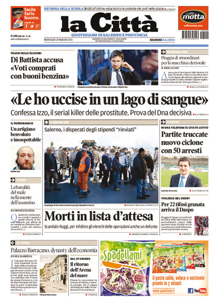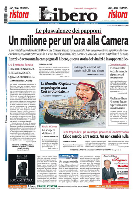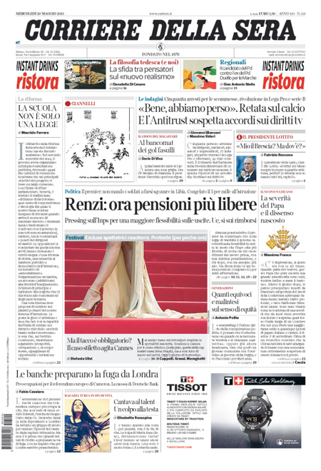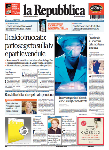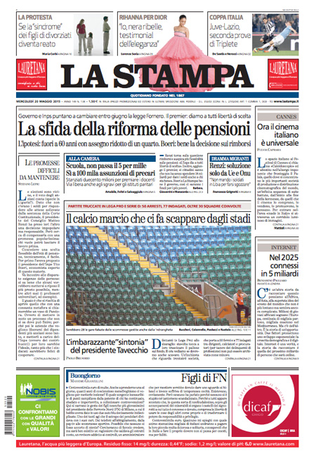 ROMA – Le prime pagine dei giornali di mercoledì 20 maggio. La Stampa: “La sfida delle riforma delle pensioni”. Il Corriere della Sera: “Renzi: ora pensioni più libere”. La Repubblica: “Il calcio truccato: patto segreto sulla Tv e partite vendite”.