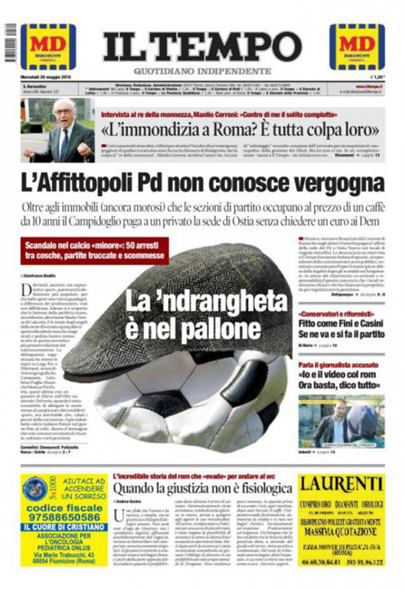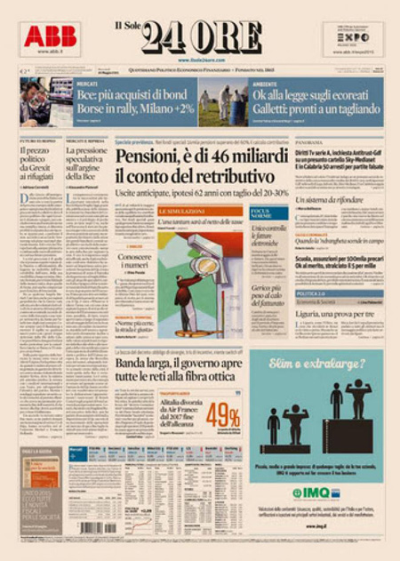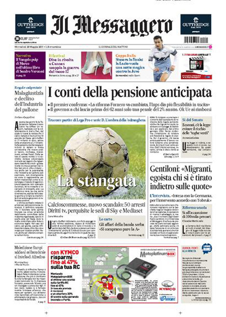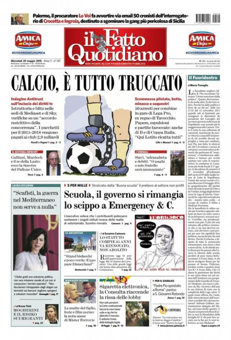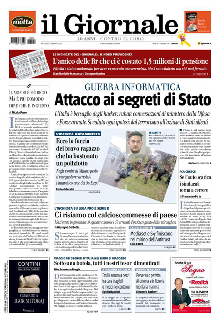 Il Sole 24 Ore: “Pensioni, è di 46 miliardi il conto del retributivo”. Il Giornale: “Guerra informatica. Attacco ai segreti di Stato”. Il Fatto Quotidiano: “Calcio, è tutto truccato”. Libero: “Un milione per un’ora alla Camera”.