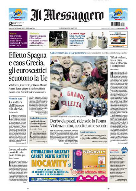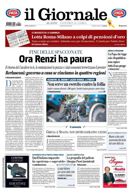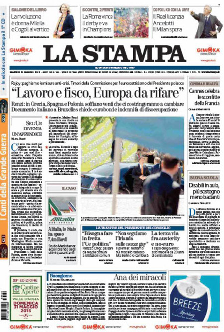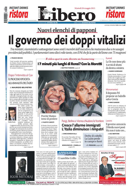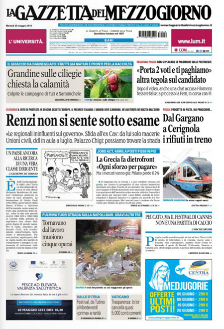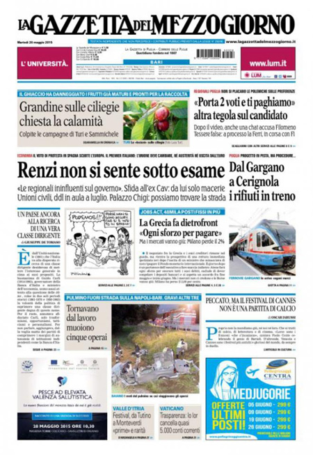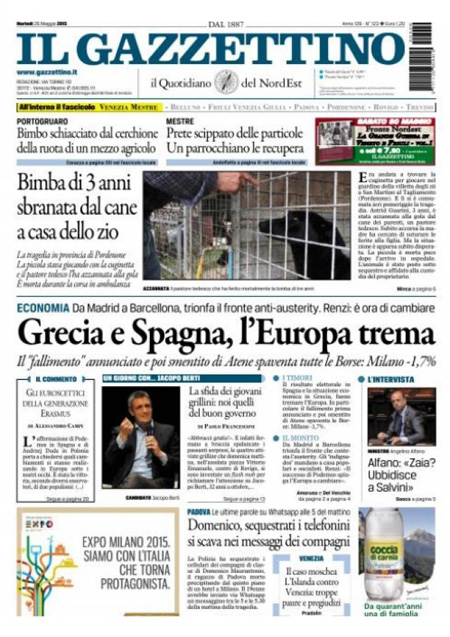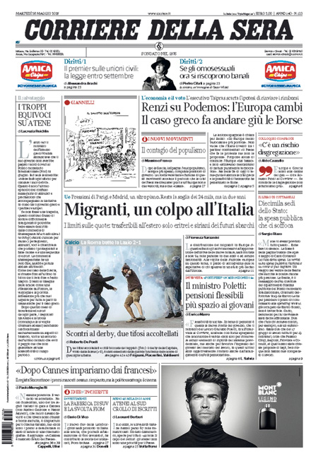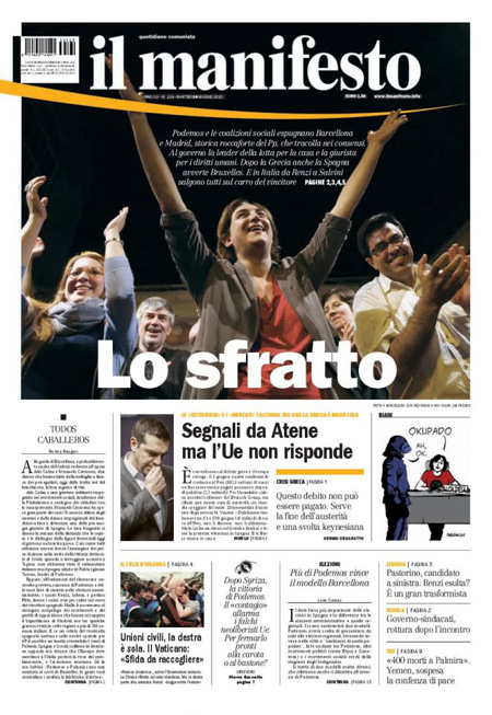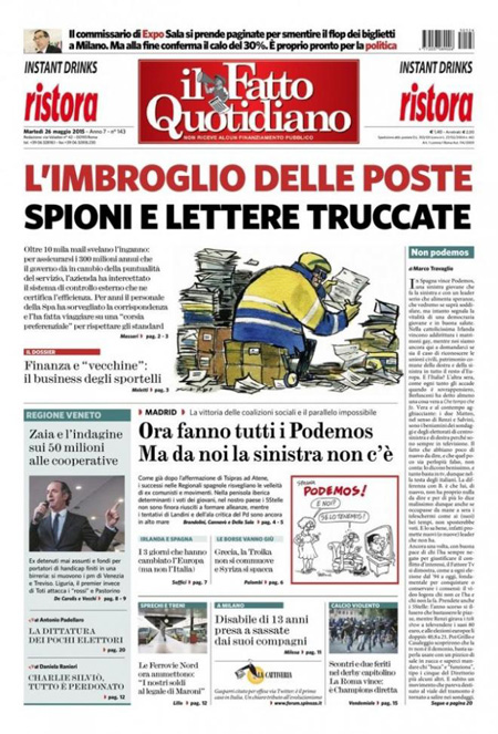 ROMA – I giornali di oggi, martedì 26 maggio, aprono con le elezioni in Spagna e con i contraccolpi per l’Europa e per le borse della vittoria di Podemos. Poi si parla ancora del festival di Cannes, dell’intervista di Papa Francesco al giornale argentino Voz del Pueblo, e dei debiti della Grecia.