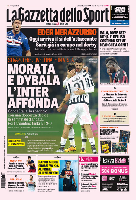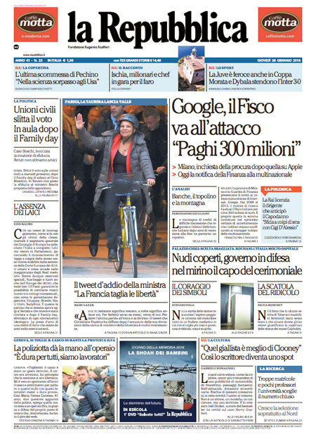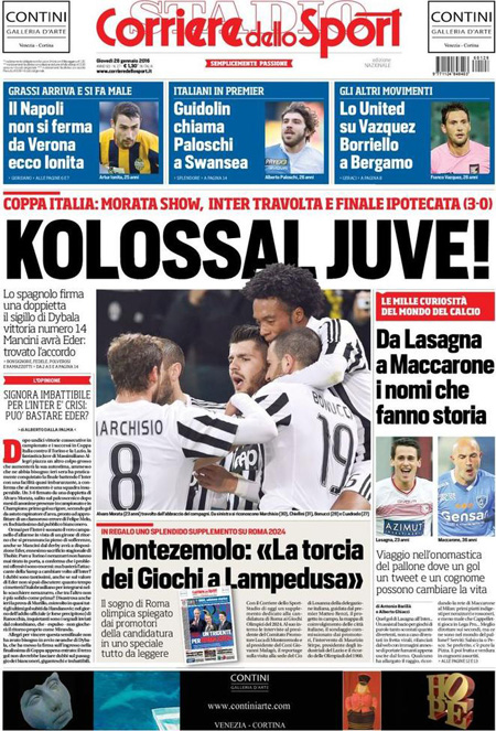 Fanno scelte diverse la Stampa, che apre sull’accordo che sarebbe stato firmato da una società italiana con l’Iran per la fornitura di 20 ATR e che violerebbe le sanzioni americane, e Repubblica, che titola sul contenzioso fra il fisco italiano e Google, mentre i quotidiani sportivi si occupano della vittoria della Juventus sull’Inter nell’andata delle semifinali di Coppa Italia.