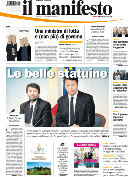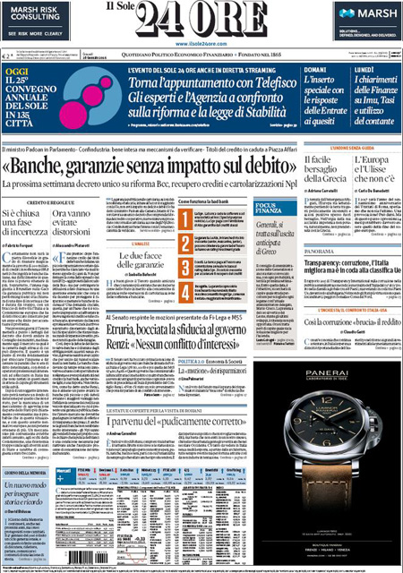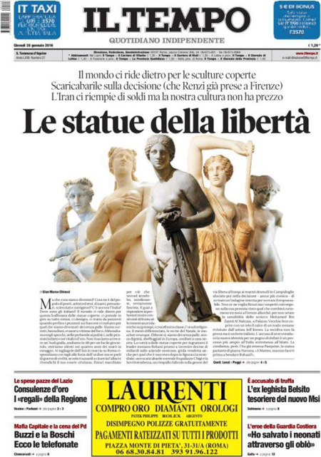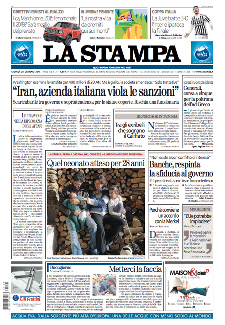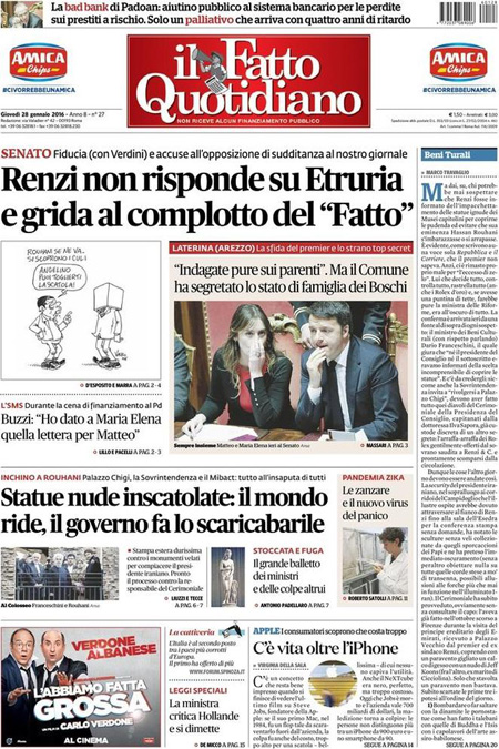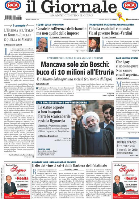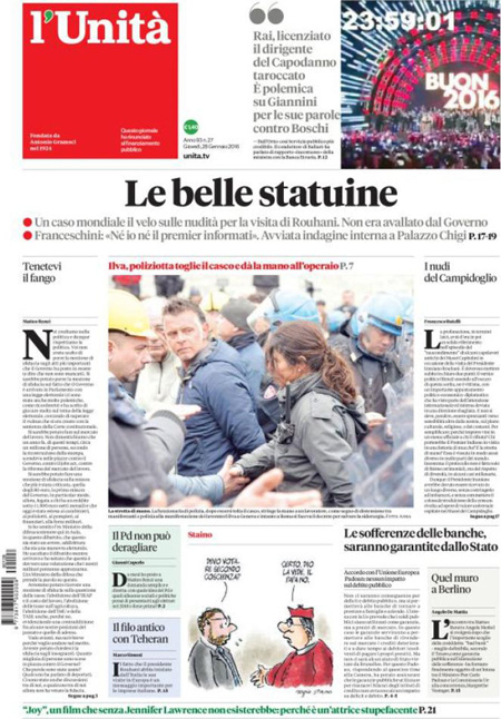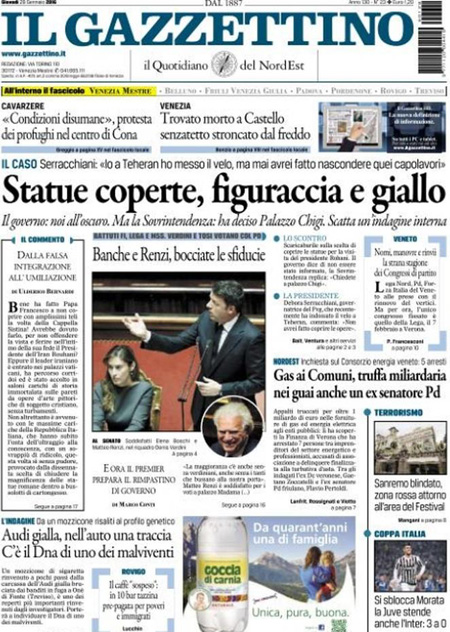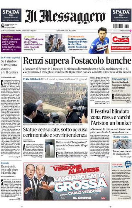 ROMA – Sono due le notizie principali in apertura sulle prime pagine dei giornali di oggi, 28 dicembre: il voto con cui il Senato ha bocciato le mozioni di sfiducia nei confronti del Presidente del Consiglio Renzi e del ministro Boschi per la vicenda delle banche, e la ricerca delle responsabilità per la copertura delle statue in Campidoglio durante la visita del Presidente iraniano Rouhani.