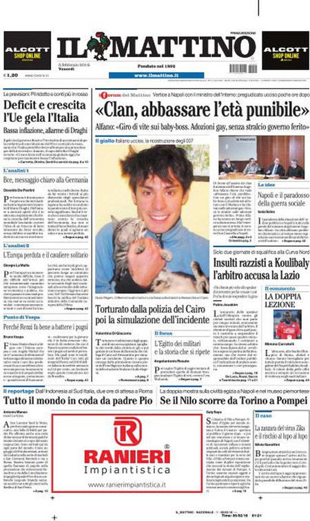 ROMA – La notizia di cui si parla su tutte le prime pagine dei giornali di oggi, 5 febbraio, nazionali e locali, è la morte di Giulio Regeni, il 28enne italiano trovato morto al Cairo – dove si trovava per ragioni di ricerca accademica – con segni di tortura e violenza sul corpo. Ieri Il Manifesto ha dato la notizia che Giulio Regeni aveva scritto dall’Egitto alcuni articoli per il giornale e questo ha molto rafforzato i timori che sia stato ucciso dalla polizia egiziana. Oggi Il Manifesto ha in prima pagina un articolo di Giulio Regeni, l’ultimo scritto prima della sua scomparsa il 25 gennaio e che il giornale non aveva ancora pubblicato.
