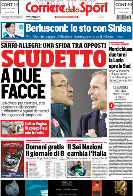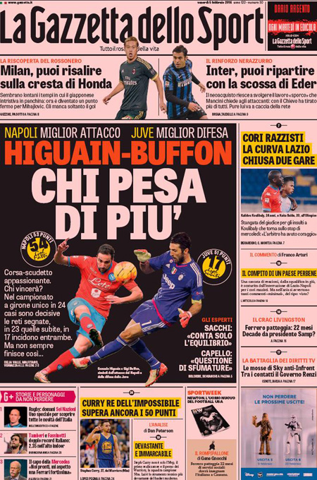 Sui giornali sportivi molto spazio alla lotta scudetto tra Napoli e Juventus che il 13 febbraio si daranno battaglia allo Stadium di Torino.