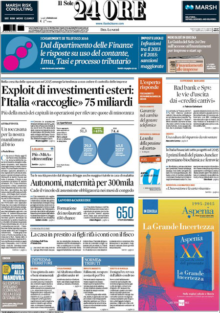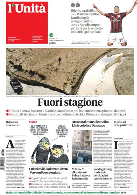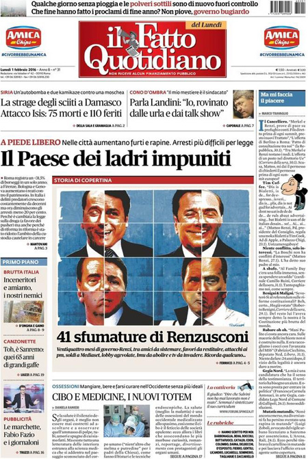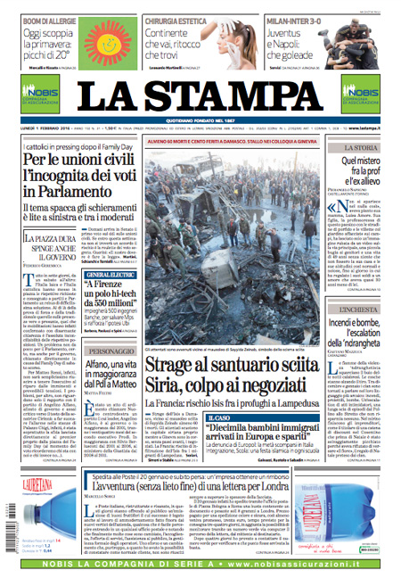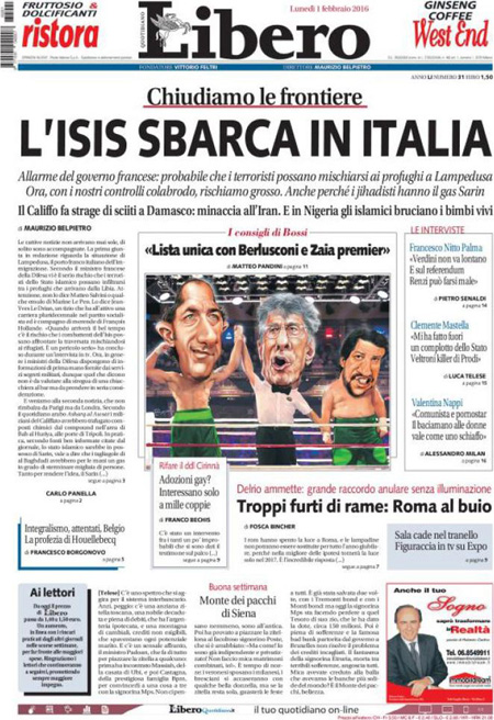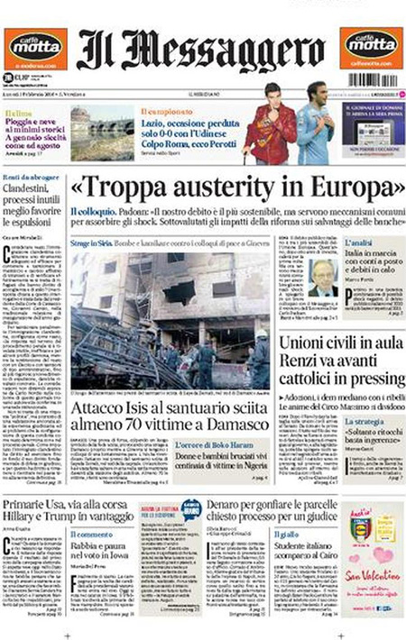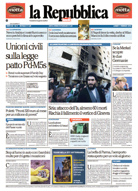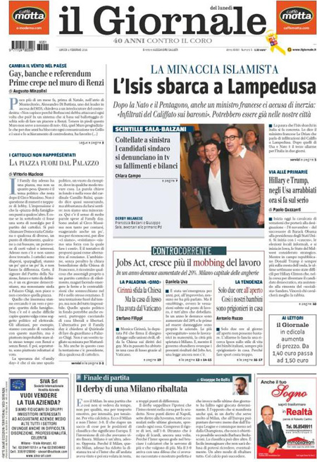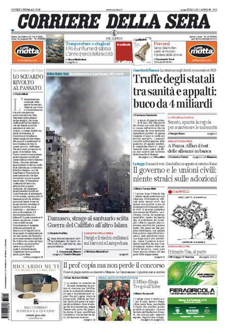 ROMA – Le prime pagine dei giornali di oggi, 1 febbraio, sono dedicate a notizie diverse: il cammino della legge sulle unioni civili al Senato, con il primo voto previsto per domani, l’attentato dell’ISIS a un santuario sciita a Damasco, mentre il Corriere della Sera analizza la relazione della Guardia di Finanza sugli illeciti nella pubblica amministrazione, Libero e il Giornale sono allarmati dalla possibile presenza di terroristi fra gli immigrati a Lampedusa, il Messaggero intervista il Ministro dell’Economia Padoan.