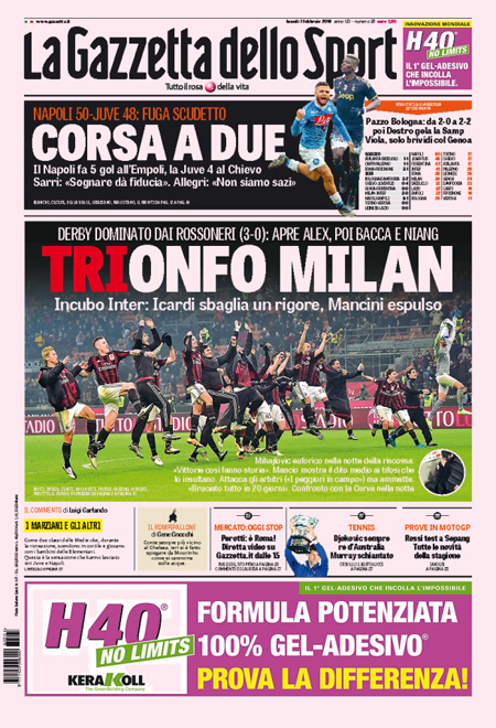 I quotidiani sportivi titolano sui risultati del campionato di calcio, con le nette vittorie di Juventus e Napoli che continuano il cammino in testa alla classifica, e quella del Milan sull’Inter nel derby di Milano.