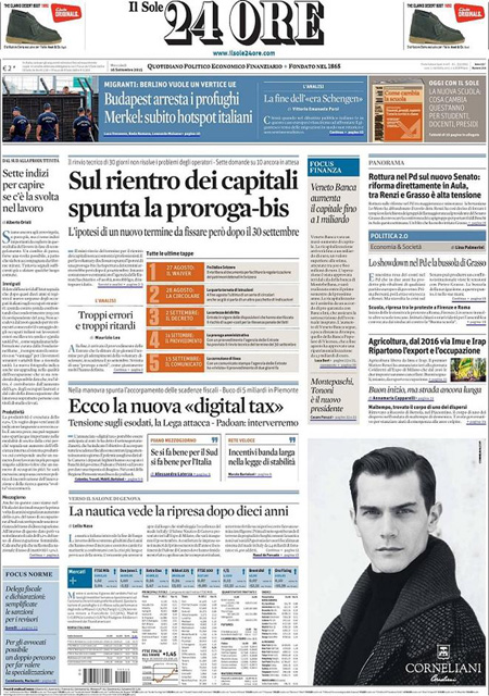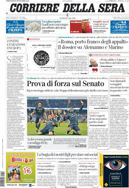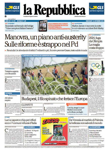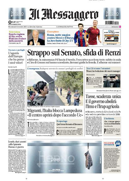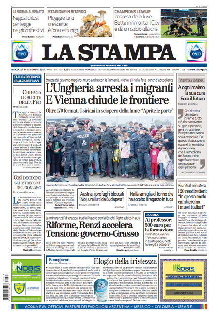 ROMA – Le prime pagine dei giornali di mercoledì 16 settembre. La Stampa: “L’Ungheria arresta i migranti. E Vienna chiude le frontiere”. Il Corriere della Sera: “Prova di forza sul Senato”. La Repubblica: “Manovra, un piano anti-austerity. Sulle riforme è strappo nel Pd”.
