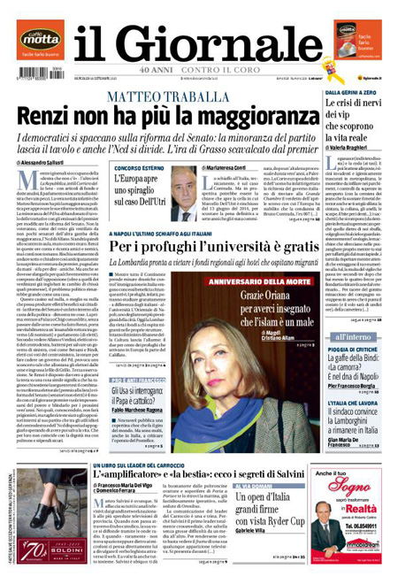 Il Messaggero: “Strappo sul Senato. La sfida di Renzi”. Il Giornale: “Renzi non ha più la maggioranza”. Il Manifesto: “Arrestiamo umani”. Libero: “La buona sola”.