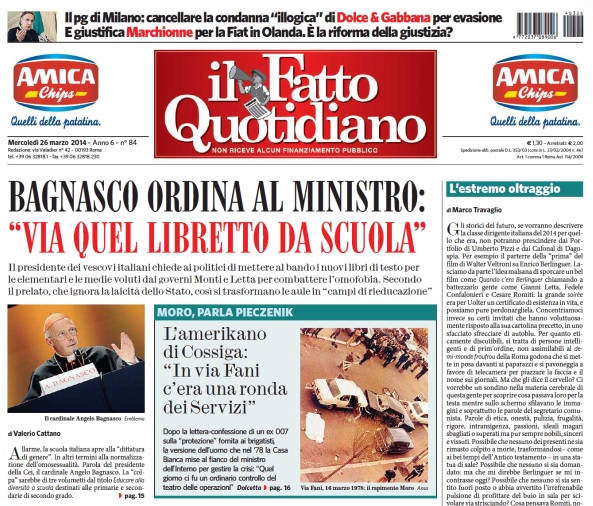 Il Fatto Quotidiano: “Bagnasco ordina al ministro: Via quel libretto da scuola”.
