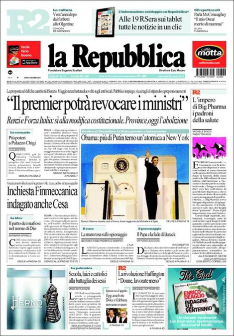 La prima pagina de La Repubblica: “Il premier potrร revocare i ministri”.